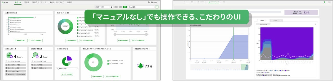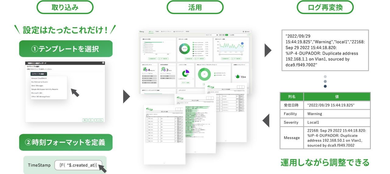 また細かなフォーマット定義は、運用しながら必要に応じて調整ができるようにと、過去・現在のログを問わず後からでも変更できるようにしました。さらに、“異常”を自動検知するための目的別レポート/アラートテンプレートを標準付帯。サイバー攻撃手法などの変化に合わせて常に最新の監視項目でご提供しています。