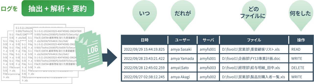 複雑で膨⼤なWindowsイベントログからアクセス記録を抽出し、「いつ・誰が・何をしたか」誰でも⼀⽬でわかる”アクセスログ”に出⼒します。この唯⼀無⼆ともいえるログの翻訳変換技術はALog Cloudでも。 ソフトウェア版と同様、Windowsログはもちろん多様なOS(*3)から収集したイベントログを分かりやすく表⽰します。(*2 特許第6501159号)(*3 詳細は別途お問い合わせください)