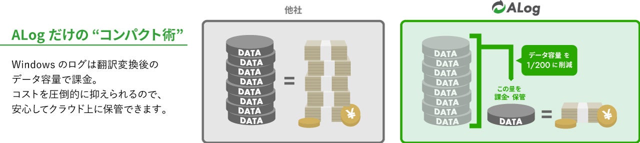 ただし、独自の翻訳変換技術によりイベントログを大幅に削減するため、他社と比較して1/200にまで削減されたデータでの課金に(*4)(*5)。これが圧倒的なコストパフォーマンスを実現した大きなの理由のひとつです。