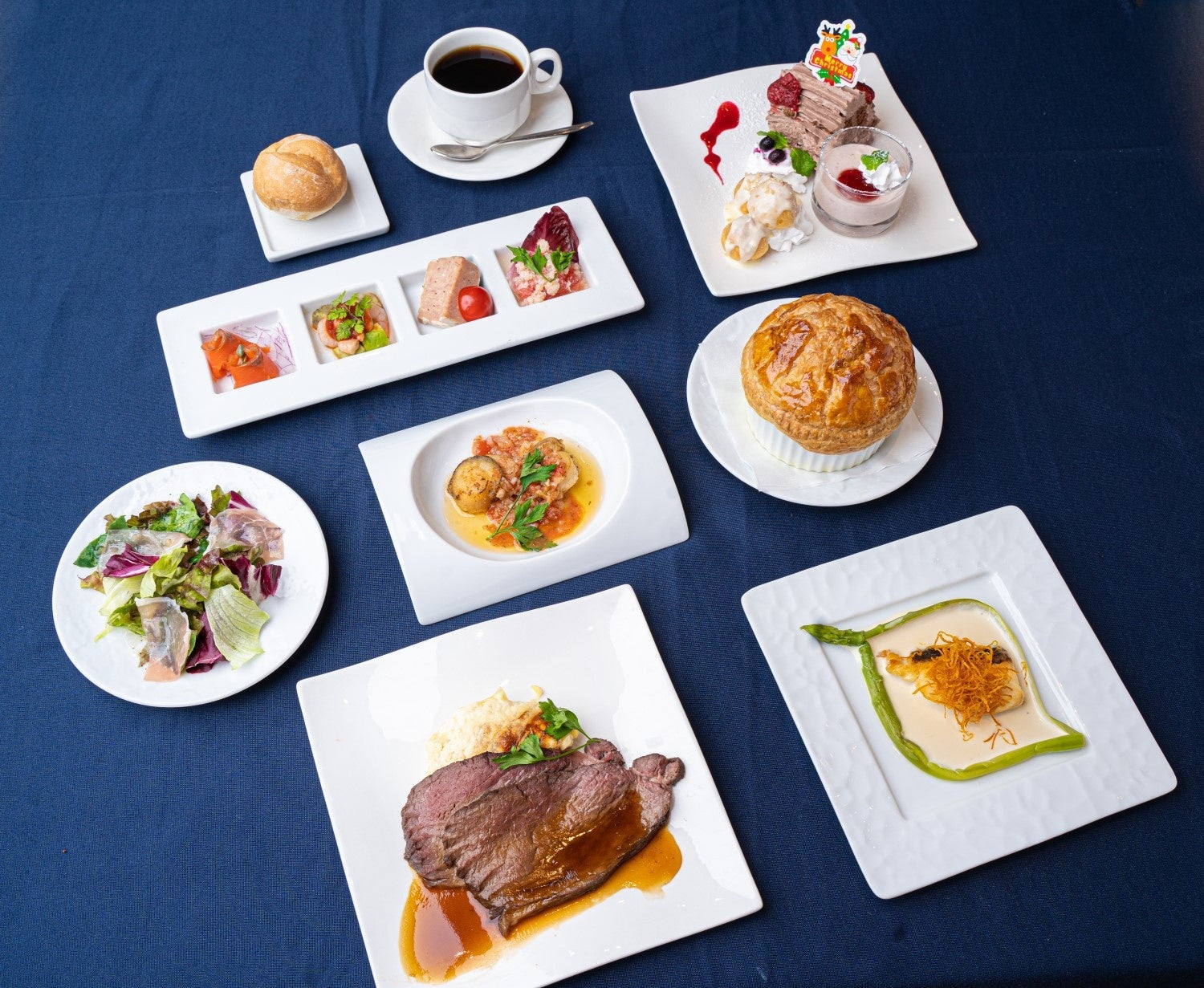 ② 料理は、お酒にも合うメインの黒毛和牛のローストビーフや、ブッシュドノエルなどのクリスマス限定のデザートプレートが付いた、本格的なクリスマスフレンチです。