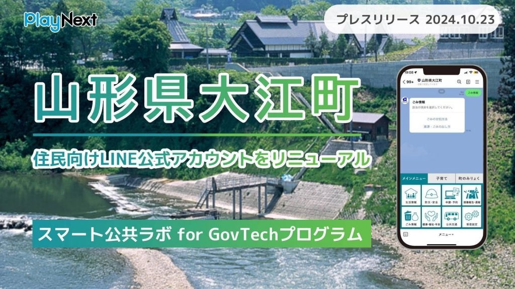 プレイネクストラボ株式会社(本社:東京都品川区、代表取締役:柏 匠、以下 「プレイネクストラボ」)の提供する「スマート公共ラボ for GovTechプログラム」が、山形県大江町(以下「大江町」)のLINE公式アカウントに採用され、2024年10月23日(水)より一般公開したことをお知らせします。