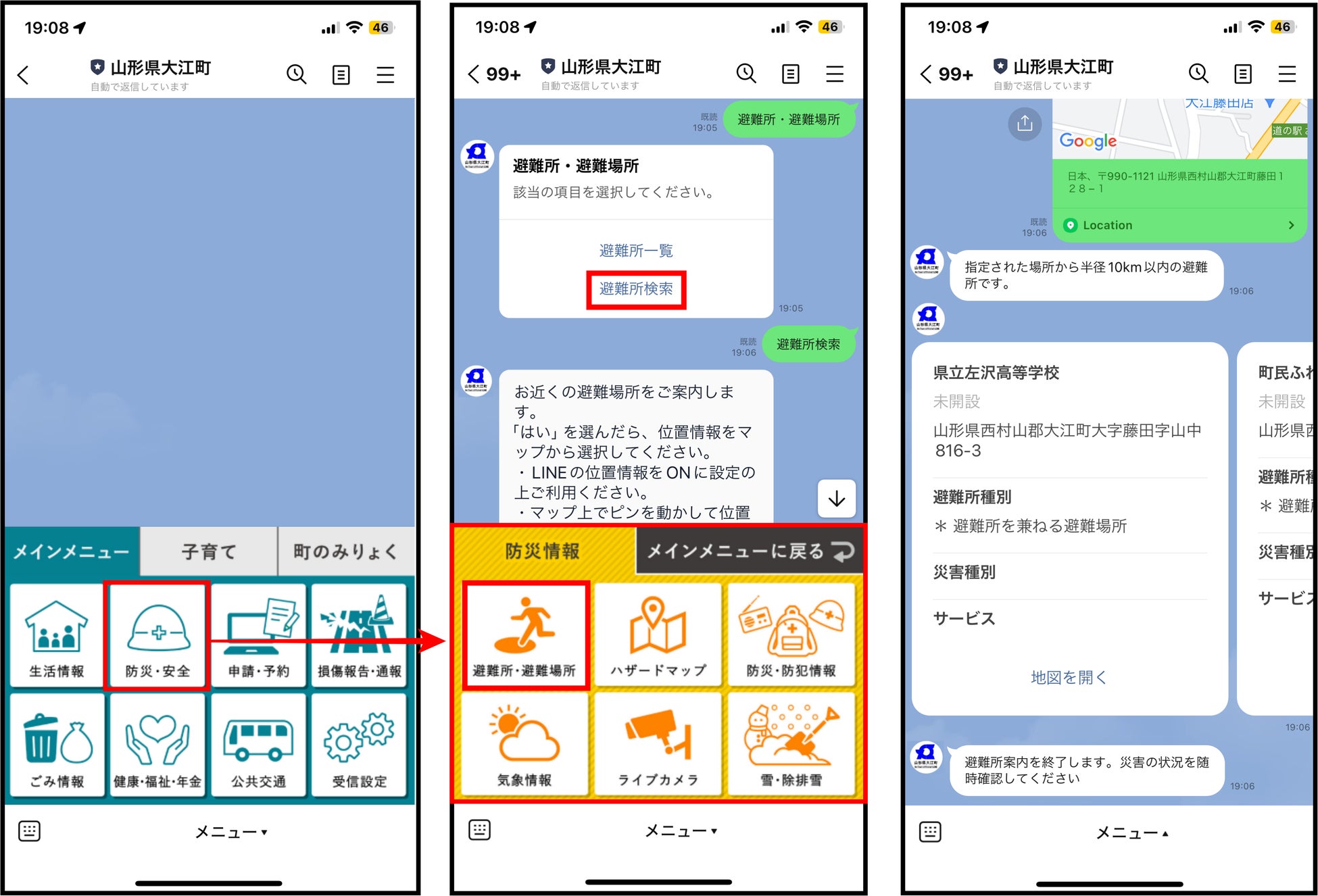 「避難所検索機能」は、チャットボットの案内に従って自身の位置情報をLINEに送信することで、近くの避難所施設を案内する機能です。普段から近くの避難所を確認しておくことができ、万が一災害が発生した際は検索した避難所の開設状況を知ることが可能です。
