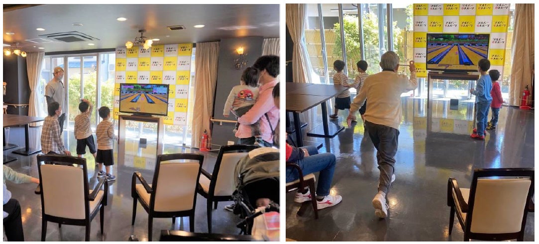 おもちゃの修理中、子供達は、隣のブースでTVゲームを使ったeスポーツを楽しみました。実際に体を動かして遊ぶボーリングゲームで、子供だけでなく、親子、お孫さんとの参加もありました。ストライクを出しては歓喜のハイタッチされる場面もあり、大変盛り上がりました。当高齢者住宅の90歳を超える入居者様もボーリングなら知っているとトライされ、楽しく交流されていました。eスポーツは、多世代で交流、シニア向けにはフレイル予防も期待でき、当社の高齢者住宅での利用を今後も推進していきます。