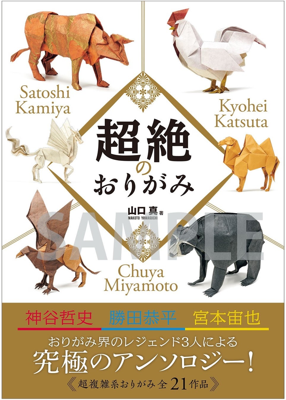 本作『超絶のおりがみ』ではおりがみ界のレジェンドである山口真さん、神谷哲史さん、勝田恭平さん、宮本宙也さんが共演。未発表の作品を含む、21点の精巧な作品の折り図を掲載しています。