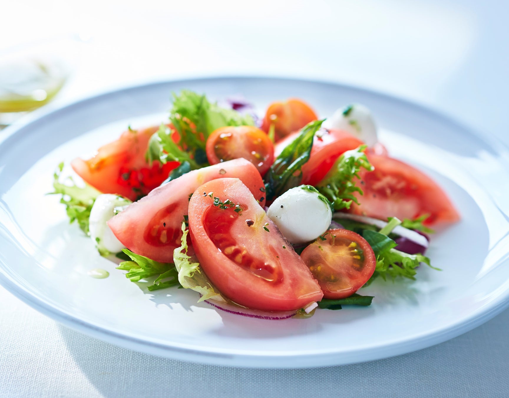 2種類の異なるトマトのおいしさが楽しめるカプレーゼ。バジルの香りやパルミジャーノ・レッジャーノの風味を堪能いただけます。