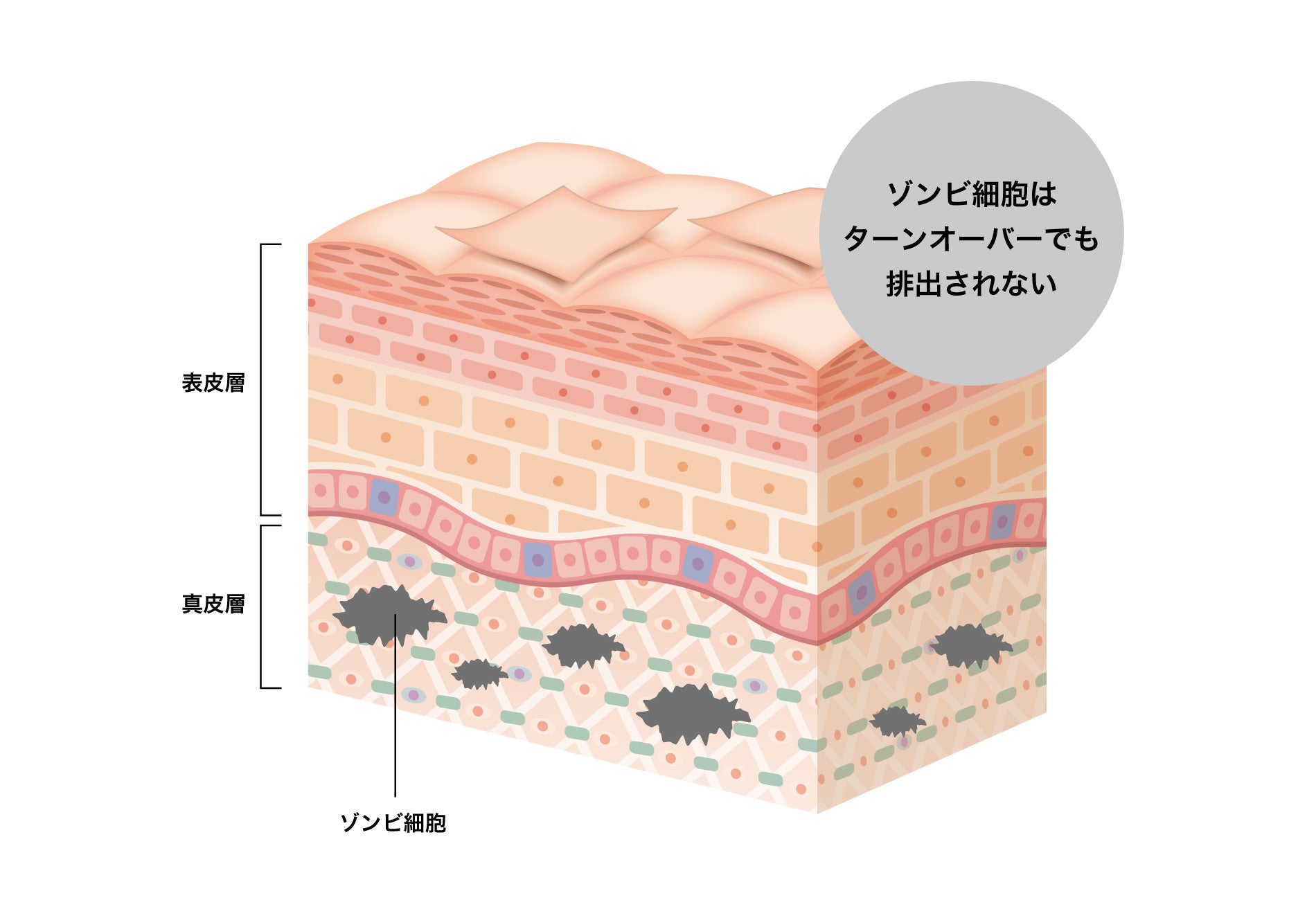 ゾンビ細胞は加齢やストレスなどによって機能を失いながらも体内に残存し、健康な細胞へ悪影響を与えるとされています。これにより、シミ・シワ・たるみなどの肌トラブルが生じやすくなることが明らかになっています。