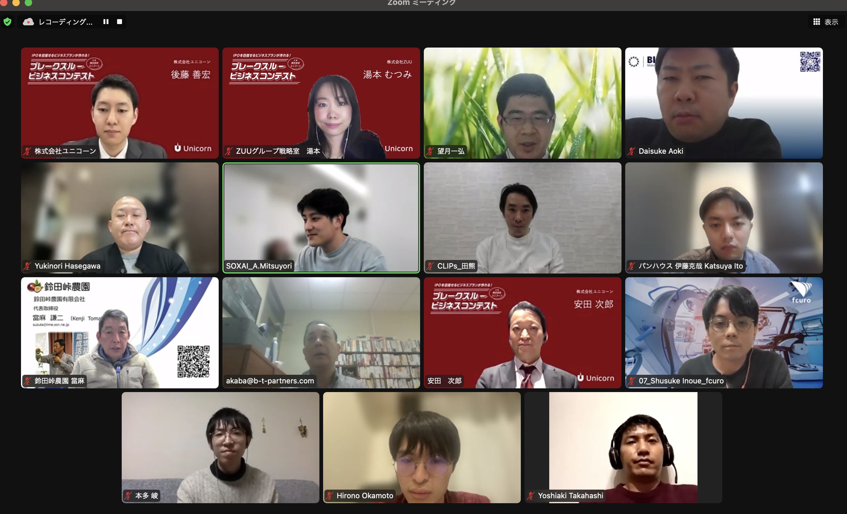 株式会社ZUU(代表取締役:冨田 和成)のグループ子会社であり株式投資型クラウドファンディング 「Unicorn」(https://unicorn-cf.com)を運営する株式会社ユニコーン(本社:東京都新宿区、代表:安田 次郎、以下「ユニコーン」)は、2022年2月25日(金)に開催された「第2回 ブレークスルービジネスコンテスト」決勝プレゼンテーション大会の入賞企業のご報告と第3会回大会のプレエントリーを開始することをお知らせ致します。