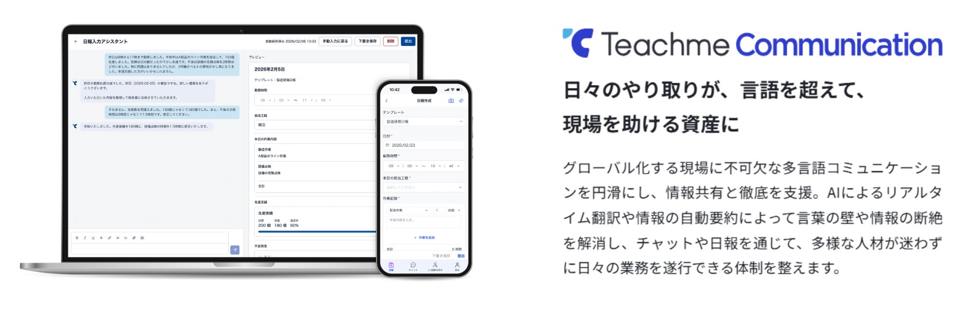日々のチャットや日報を、言語を超えて、現場を助ける資産に変えるプロダクトです。AIによるリアルタイム翻訳と自動要約により、多様な人材が迷わず業務を遂行できる体制と、知見が自然に蓄積される仕組みを構築します。