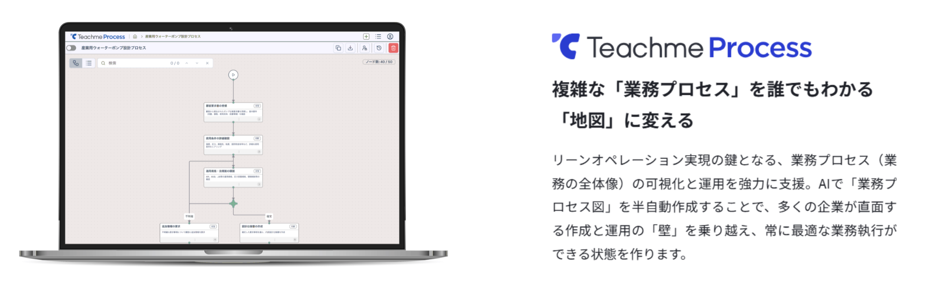 チャット形式で指示するだけで、複雑な業務フローをAIが自動描画。白紙から作成する手間を省き、現場の誰もがスピーディーに「業務の地図」を構築・更新できます