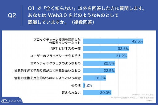 Q1 で「全く知らない」以外を回答した方に、「Q2.あなたは Web3.0 をどのようなものとして認識していますか。(複数回答)」(n=80)と質問したところ、「ブロックチェーン技術を活用した分散型インターネット」が 42.5%、「NFT ビジネスの一部」が 32.5%、「ユーザーのプライバシーを守る手法」が 31.2% という回答となりました。