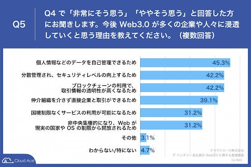 Q4 で「非常にそう思う」「ややそう思う」と回答した方に、「Q5.今後 Web3.0 が多くの企業や人々に浸透していくと思う理由を教えてください。(複数回答)」(n=64)と質問したところ、「個人情報などのデータを自己管理できるため」が 45.3%、「分散管理され、セキュリティレベルの向上するため」が 42.2%、「ブロックチェーンの利用で、取引情報の透明性が高くなるため」が 42.2% という回答となりました。