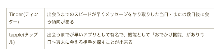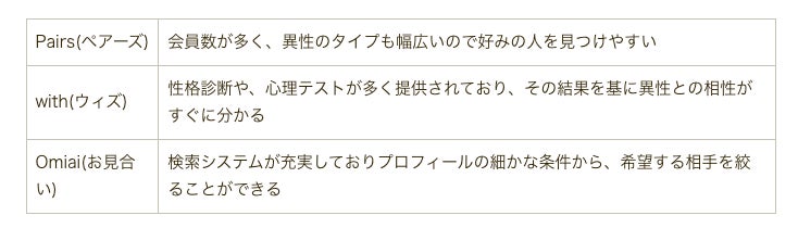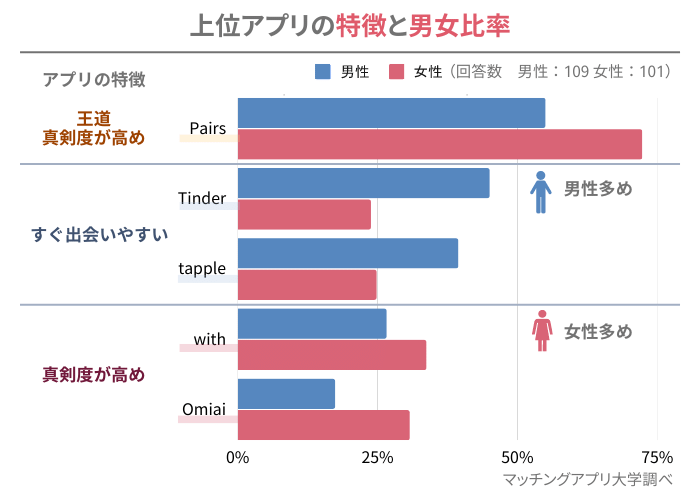 ・女性が多いアプリ → Pairs、with、Omiai(真剣度が高めの王道アプリ) ・男性が多いアプリ → Tinder、tapple (すぐ出会いやすいアプリ) |