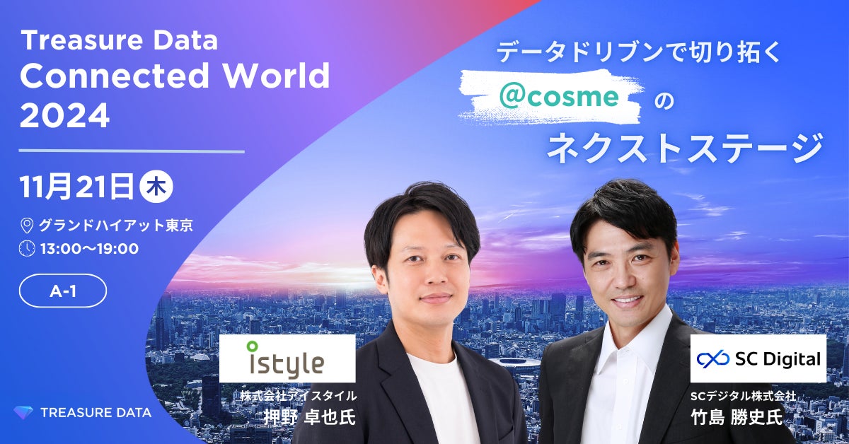 SCデジタル株式会社( 代表取締役 社長執行役員CEO:中橋 大樹、以下「SCデジタル」)は、トレジャーデータ株式会社( 社長執行役員:三浦 喬、以下「トレジャーデータ」)が2024年11月21日(木)に開催する「Treasure Data Connected World 2024」 において、株式会社アイスタイル( 代表取締役社長:遠藤 宗 以下、「アイスタイル」)押野様をゲストに迎え登壇いたします。