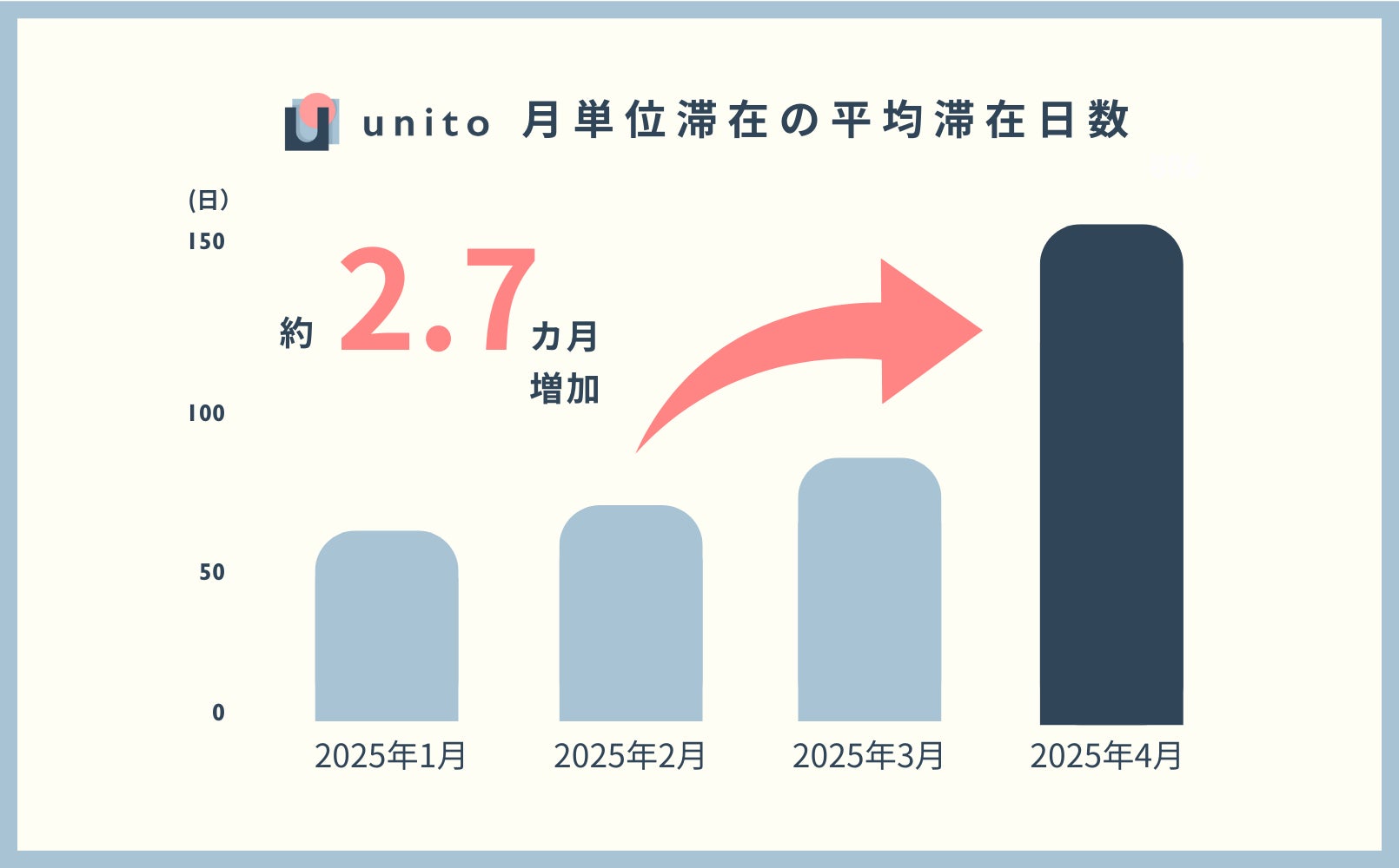 今回の調査結果の通り、Unitoでは近年、日本版デジタルノマドビザや万博開催の影響もあり「住む」と「泊まる」を融合させた “ フレキシブルリビングカルチャー ” に親しみのある訪日客の皆さまに、unitoでの暮らしを体験いただく機会が増えています。日本国内においてもコロナ禍を契機に、サービスアパートメントやアパートメントホテルといった新しい住まいのかたちが徐々に浸透しはじめました。