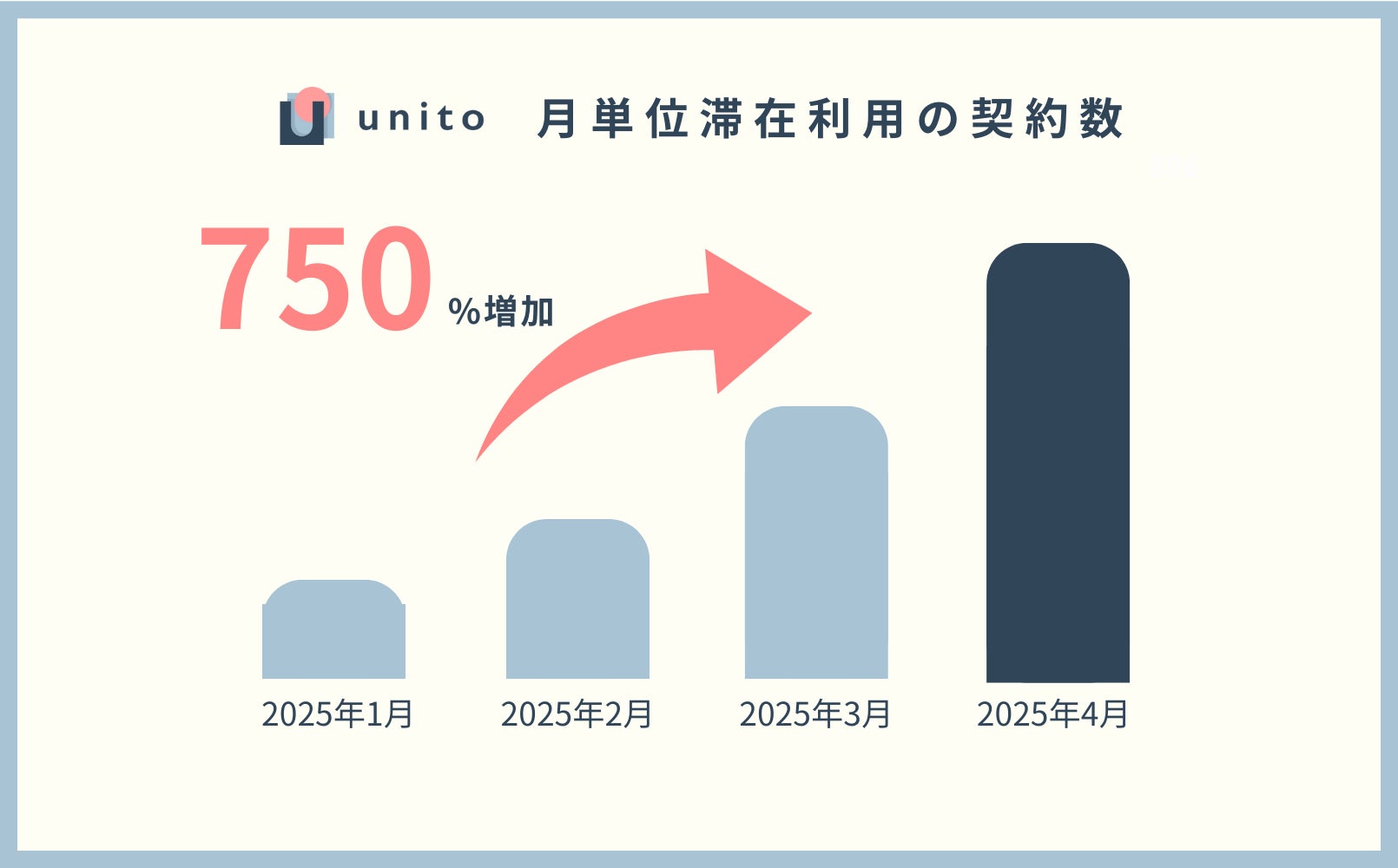 2025年4月の月単位滞在契約数は、2025年1月と比較して750%増と大きく伸長しました。背景には、国際的イベントを契機としたプロジェクト型滞在をはじめ、従来のホテルや賃貸住宅では対応が難しい「月単位」の中長期滞在ニーズの顕在化が挙げられます。