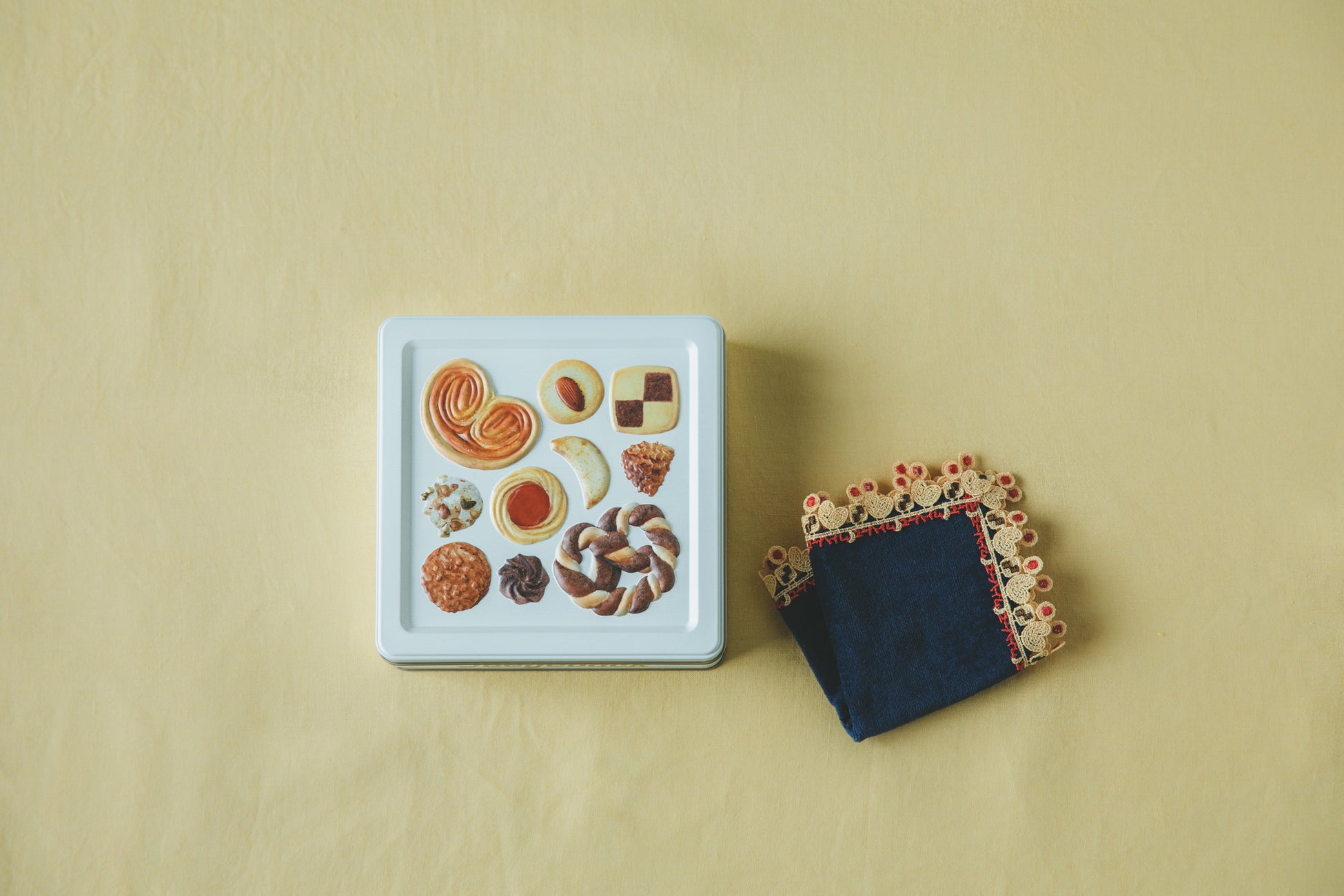 「テーゲベック」は、ナッツ・ジャム・チョコレートなど、見た目も食感も全て異なるビスケットの詰め合わせです。職人の手作業が欠かせないこのお菓子を、横浜で100年を越える老舗・近沢レース店にレースタオルハンカチで表現いただきました。