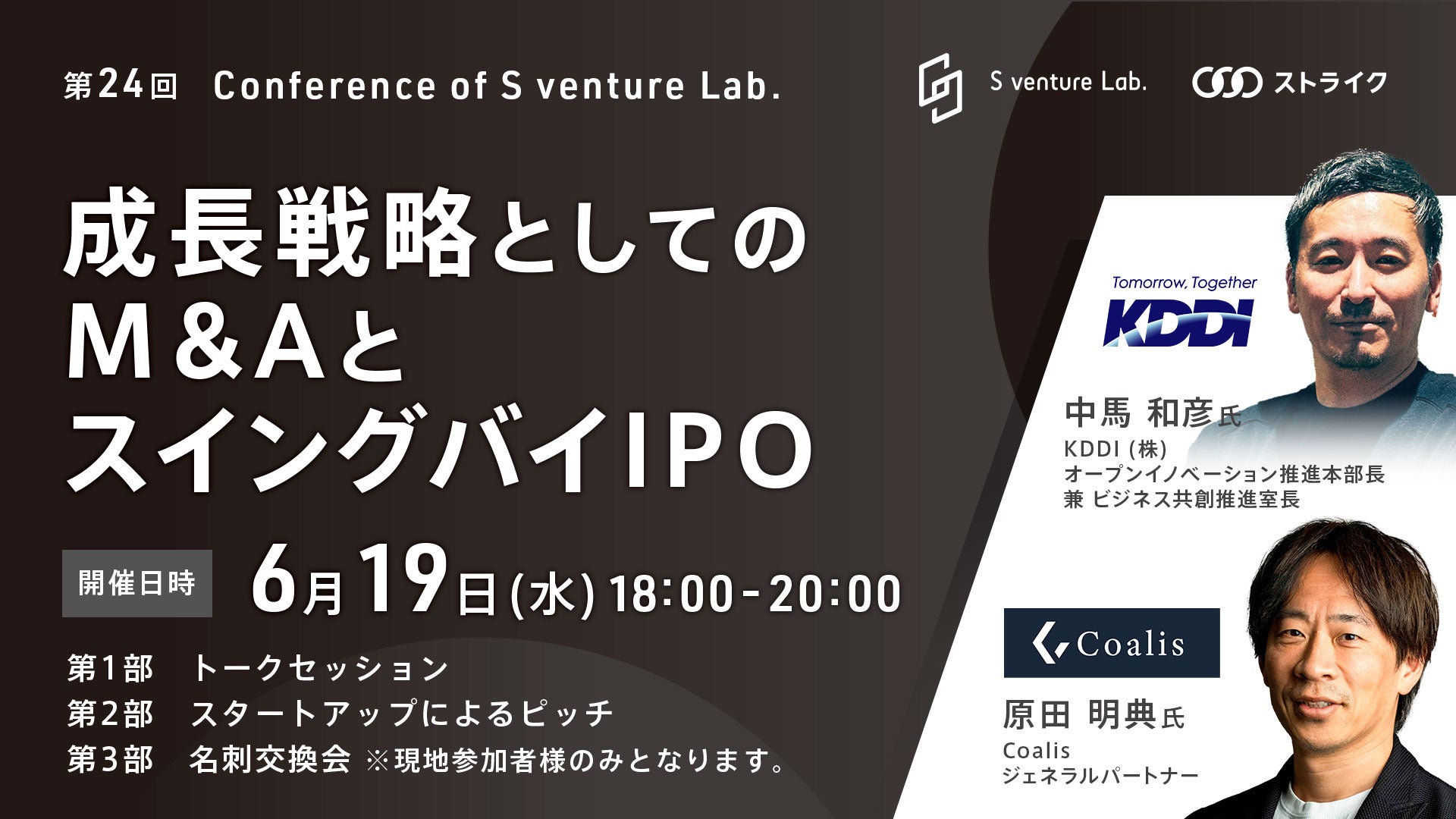 スピーカーにはKDDI(株) オープンイノベーション推進本部長兼ビジネス共創推進室長 中馬 和彦氏とCoalis ジェネラルパートナー 原田 明典氏をお招きし、企業成長の新たな手法として注目される「スイングバイIPO」についてお話いただきます。