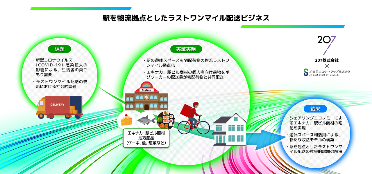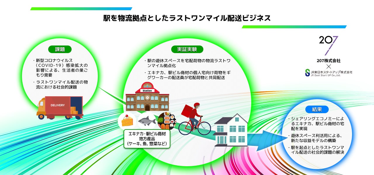 JR東日本の子会社でベンチャーへの出資や協業を推進するCVCのJR東日本スタートアップ株式会社(以下、JR東日本スタートアップ 代表取締役社長:柴田 裕)と、物流業界のラストワンマイルのDX化を目指す207株式会社(以下、207 代表取締役社長:高柳 慎也)は、1月15日(土)より、ギグワーカーによるご自宅までのラストワンマイル配送を活用したエキナカ商品の宅配サービスと、駅の遊休スペースを宅配荷物の物流拠点として活用する実証実験をいたします。