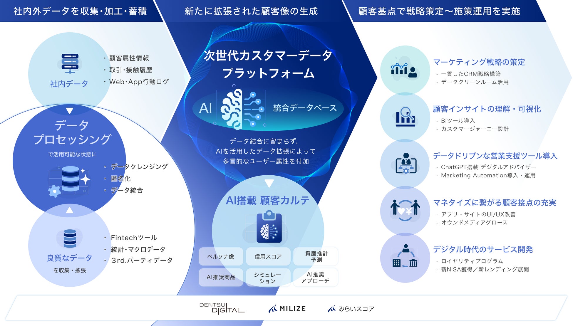 このような背景を受け、この度、金融機関が直面している業界課題の解決を目的に、金融ビジネスにおける豊富な知見や実績、異なる強みを有する3社が協業することで、データとテクノロジーを軸とした、深い顧客理解に基づく施策展開を実現する次世代型ソリューションを一気通貫で提供します。