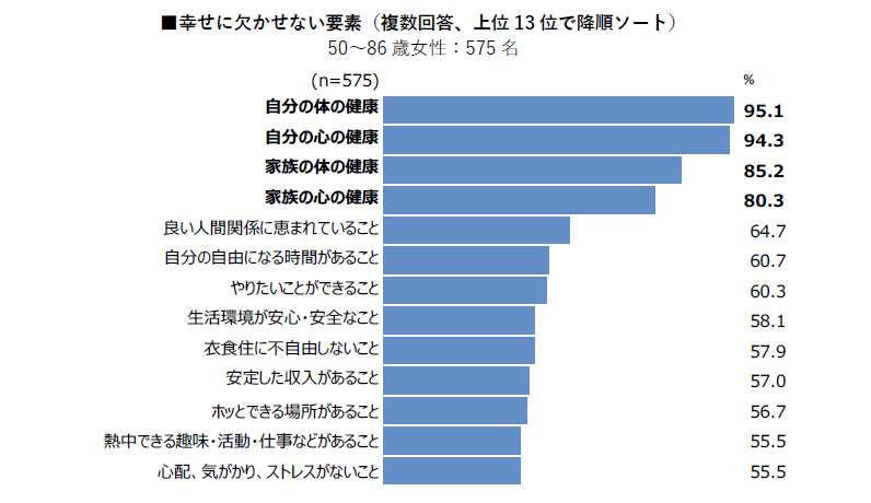 幸せに欠かせない要素上位は「自分や家族の体や心の健康」
