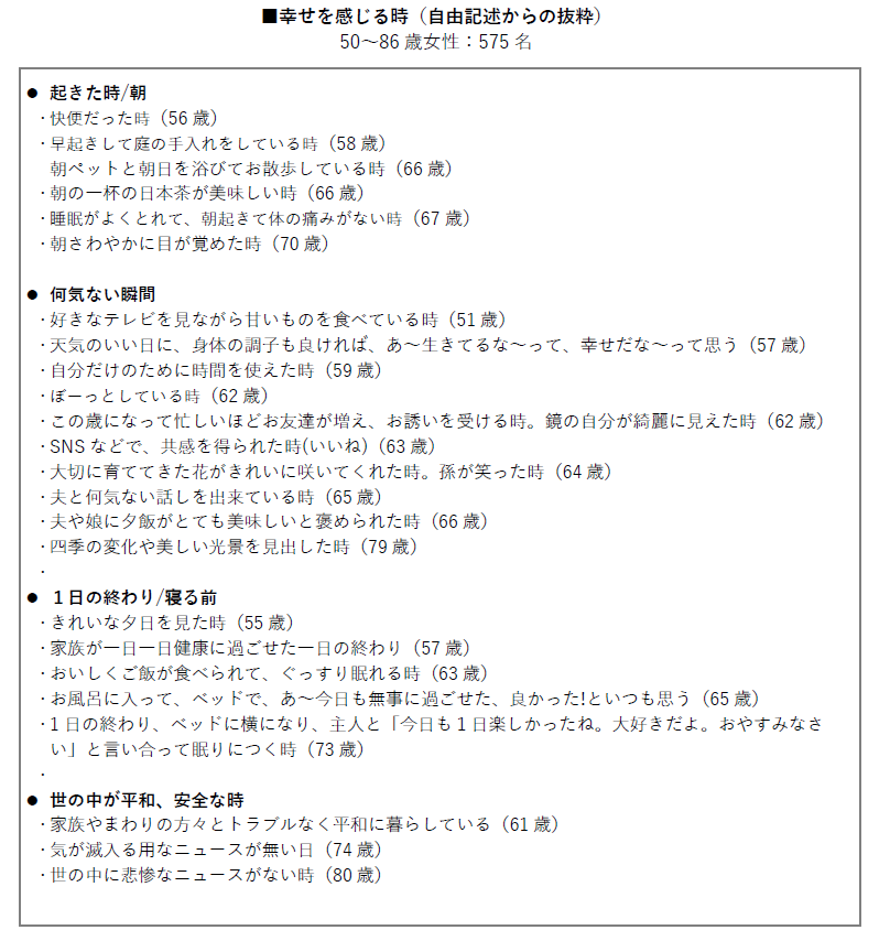 今回、世代ならではの幸せの感じ方に関するヒントを「幸せを感じる時」の自由記述に見つけました。起きた時~何気ない瞬間~寝る前の3地点ありました。朝は、「今日も朝がきたと思った時」「目覚めが良い時」「熟睡できた時」「快便だった時」など健康や生命感あふれる記述が複数ありました。昼は「雲ひとつない青空を見上げた時」「気持ちの良い風を感じた時」など自然とのふれあい、「家族が健康で元気に過ごせること」「穏やかな時間が流れてついうたた寝する時」「愛犬が膝にのった時」など何気ない時間や家族に関することが挙がりました。夜は「きれいな夕日を見た時」「ゆっくりお風呂に入った時」「1日充実していたと感じる時」に対して、感謝のコメントが目立ちました。歩んできた自分の人生を肯定し、生存や健康を実感し、ささやかな日常の中に幸せを見出しています。時代を映してか、「気が滅入る悲惨なニュースがない日」「自然災害に遭っていない」など、平和や安全を願う記述も見られました。