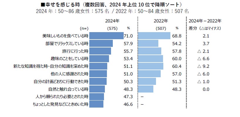 今どきの50代以上の女性は、承認や自己実現欲求よりも、生理的・安全・社会的欲求が満たされた時に幸せを感じやすいということになります。身近な生活に幸せを見出す傾向は強まっていることも今回わかりました。幸せを感じる時の1位は前回調査と変わらず「美味しいものを食べている時」で、2.2ポイントアップしました。興味深いのは2位の結果です。「部屋でリラックスしている時」が3.7ポイントアップ。「旅行に行った時」、「趣味をしている時」、「新たな知識を得た時・自分の知識を深めたい時」、「他の人に感謝された時」よりも上位にランクインしたのです。「ONのタイミングだけでなく、OFFのリラックス時にもアプローチすることで、彼女たちに幸福を感じてもらいやすくなる」ということを表しているのではないでしょうか。