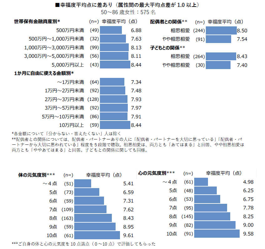 ・さらに差が大きかったのは、世帯保有金融資産、1か月に自由に使える金額。配偶者の有無別での幸福度にはほとんど差がみられなかったが、配偶者や子がいる人では配偶者や子との相思相愛度であった。また、本人の体や心の元気度による違いも顕著であった。