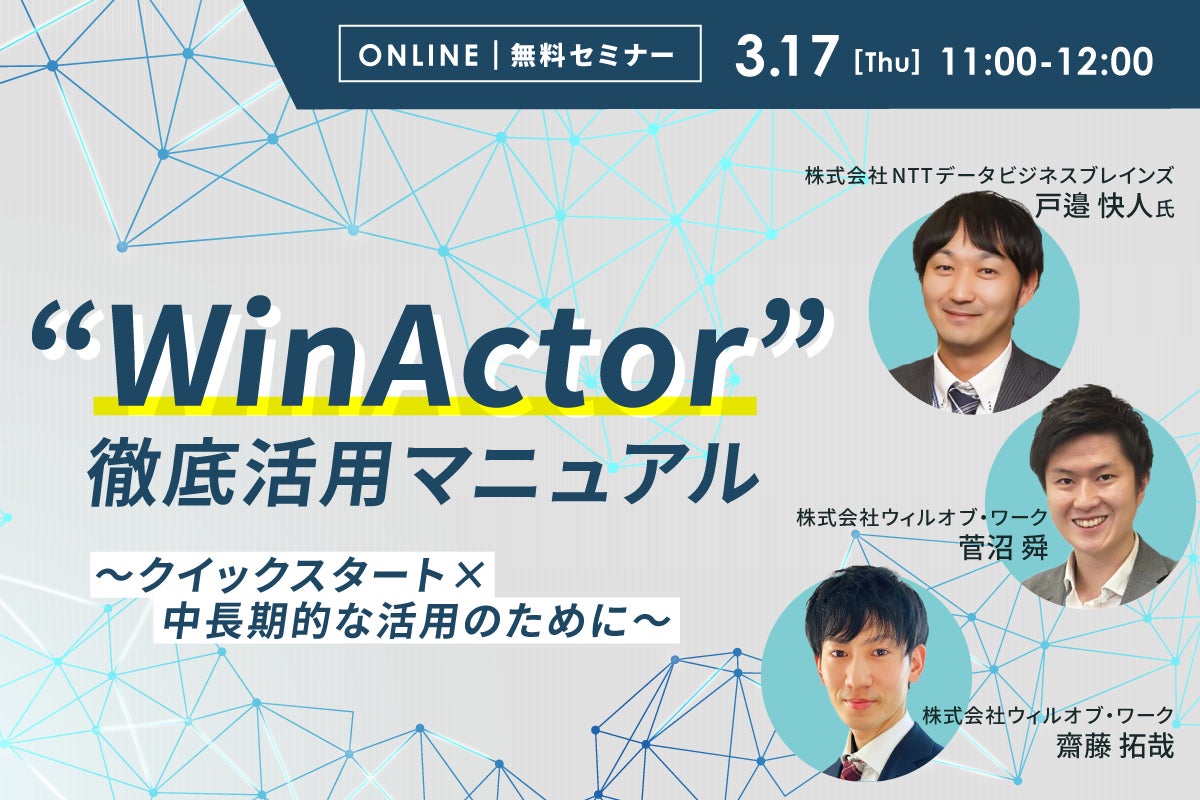 本セミナーでは、NTTデータビジネスブレインズの戸邉氏とWinActor販売特約店であるウィルオブ・ワークの菅沼・齋藤より、6,000社以上に導入され国内で高いシェア率を誇るRPAツール『WinActor(ウィンアクター)』(https://www.nttd-bb.com/service/winactor/)の製品紹介と活用の秘訣について、『WinActor』のデモシナリオ実演を交えながら、両社がもつ数多くの導入事例をもとにより具体的なイメージ、理解を頂ける内容をご紹介します。
