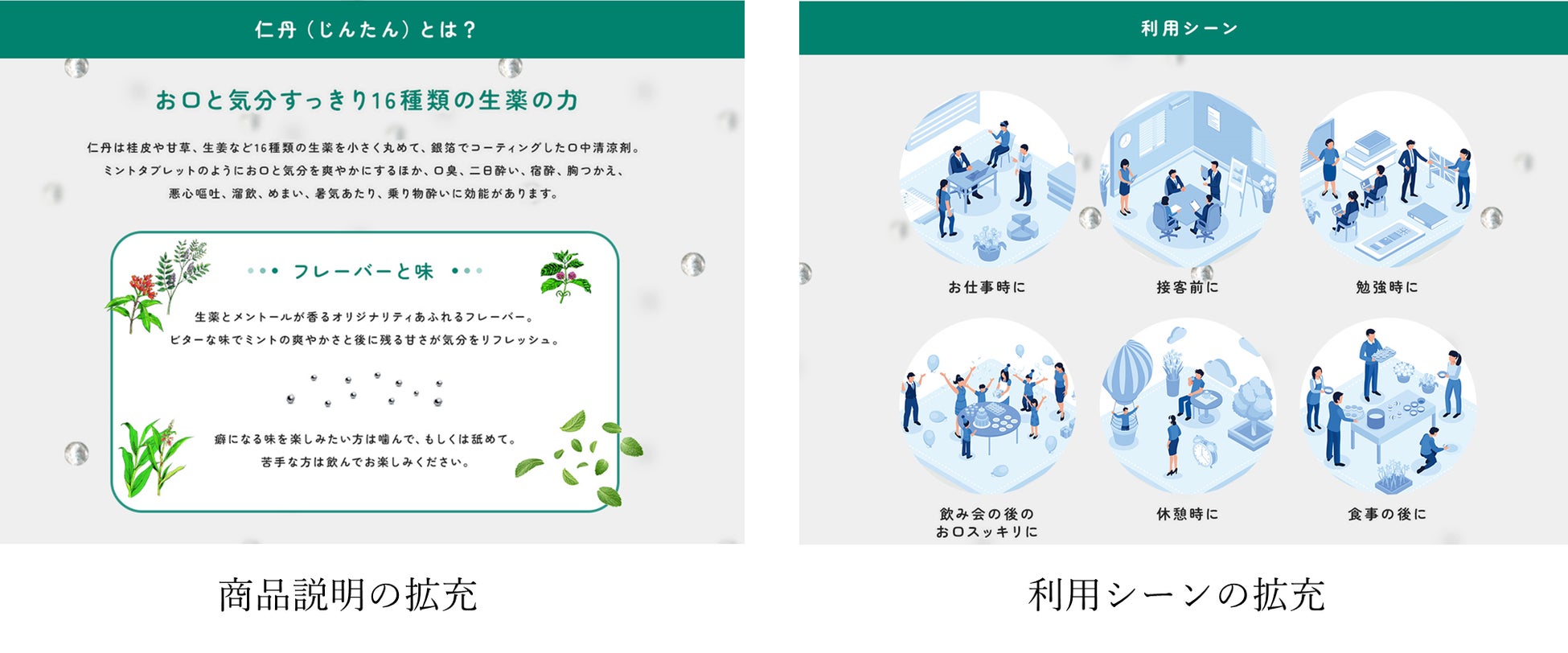 今回のリニューアルは、当社が推奨する「仁丹」の利用シーンを追加し、用途を明確にすることで、「仁丹」を知らない方でも気軽に始められるようにする他、これまで以上に「仁丹」とは何かがわかるような構成にしました。