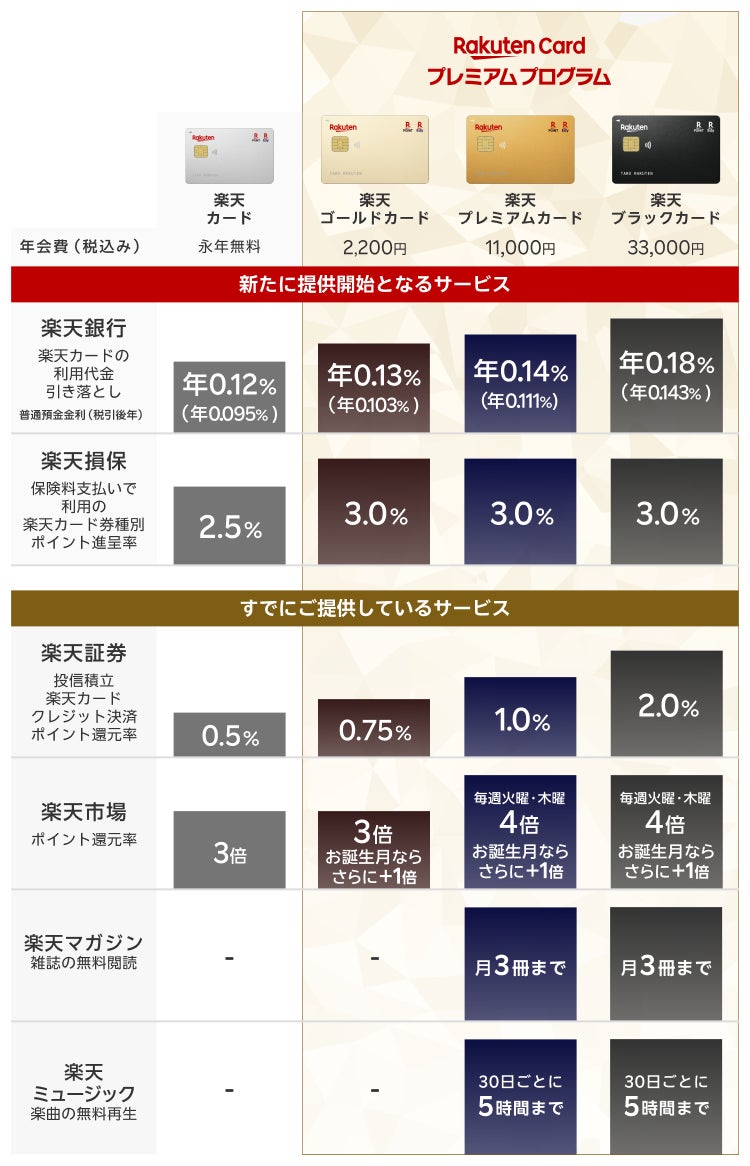 「楽天ブラックカード」、「楽天プレミアムカード」、「楽天ゴールドカード」の会員様を対象にした「楽天カードプレミアムプログラム」を提供開始