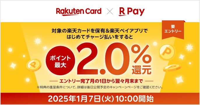 さらに、本プログラムの提供開始を記念し、楽天ペイメント株式会社(以下「楽天ペイメント」)が運営するキャッシュレス決済サービス「楽天ペイ」において、本プログラム対象の楽天カードを保有している会員様に楽天ポイントを上乗せして進呈するキャンペーンを2025年1月7日(火)より開催します。詳細は後日「楽天ペイ」ホームページにてご案内します。