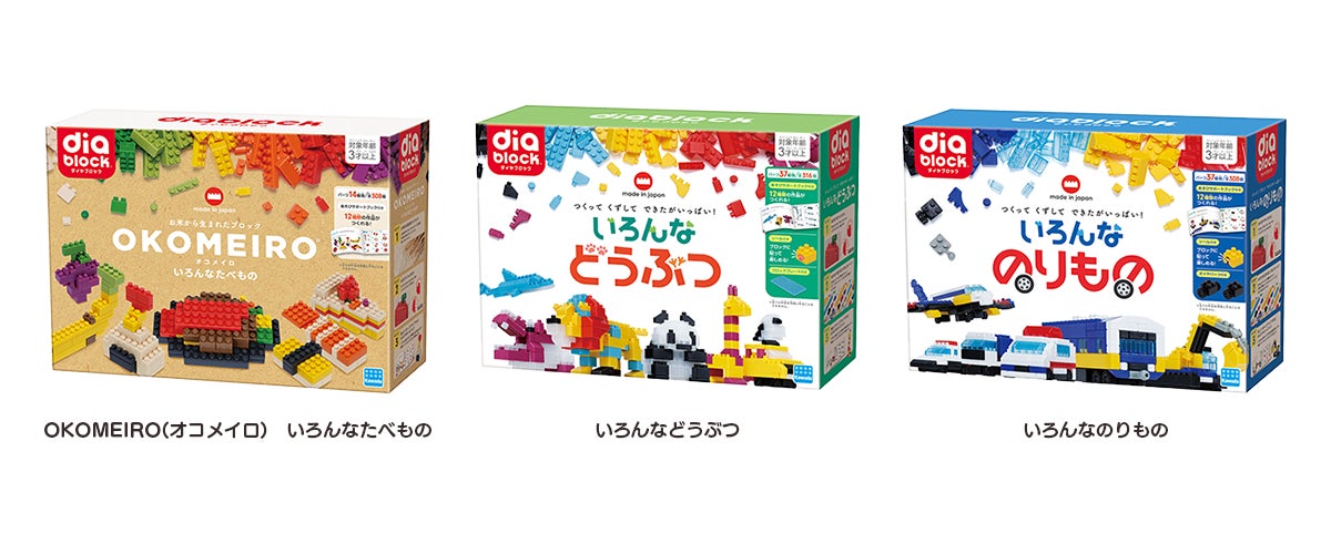 「ダイヤブロック®」(発売元:株式会社カワダ)は、1962年に発売された日本製のブロックです。お子さまが安心して遊べるように組み立てやすく外しやすい形状にこだわり、70周年を迎えた 2022 年には、人と環境にやさしいお米から生まれたブロック「OKOMEIRO(オコメイロ)」を発売。その後、「HIKARIIRO(ヒカリイロ)」「KIHONIRO(キホンイロ)」など、色や素材、質感の異なるブロックを豊富に展開しています。