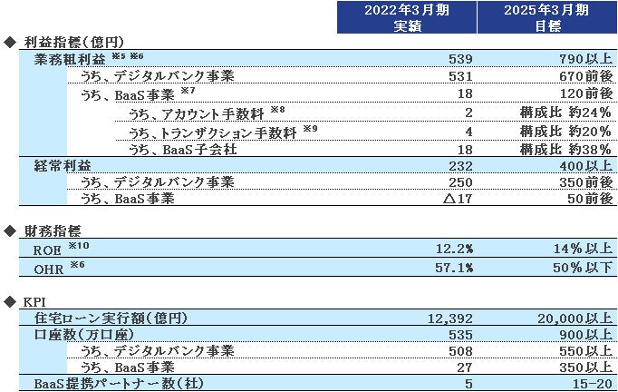 ※5:BaaS事業の収益費用の計上方法について、2022年9月に「預金収益の導入」「営業経費の精緻化」の観点で変更を行っているため、本表ではかかる変更を2022年3月期の実績値に遡及的に適用して振替後の数値(未監査)を記載しております(遡及適用前の業務粗利益実績値はデジタルバンク事業が556億円、BaaS事業が17億円)。事業間で一部内部取引を行っており、計上科目が異なることから、業務粗利益にかかる各事業の合計は全体の数値と必ずしも一致しません。