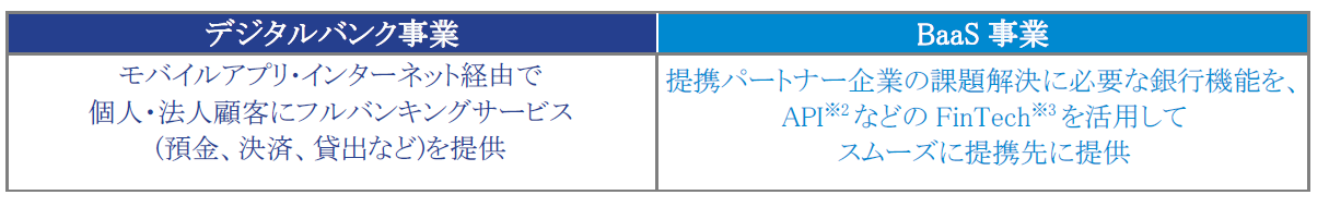 新規事業として、企業ではなく人を中心に考えた、データを安心安全に利活用できるデータ社会の実現に向けて、事前にお客さまからデータ利用の同意をいただいたうえで、アライアンス企業と連携して、新たなデータマーケティングサービスを提供することを検討しております。また、BaaS事業と提携先等の業界ノウハウにブロックチェーンという新たなテクノロジーを融合し、事業会社のDX支援及びサプライチェーンファイナンスプラットフォームの構築を検討しております。
