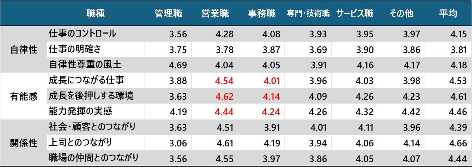 有能性の3項目である「成長につながる仕事」「成長を後押しする環境」「能力発揮の実感」の全てで、営業職と管理職の顕著な差が見られ、業務特性が寄与していることが予想される。