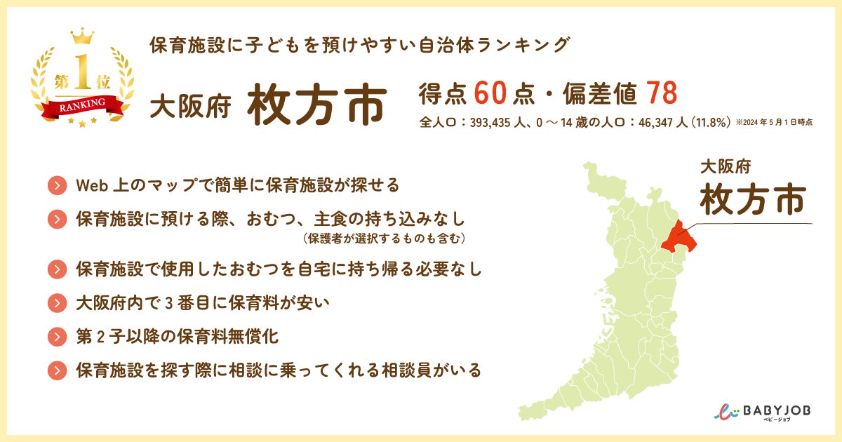 【大阪府版】2024年保育施設に子どもを預けやすい自治体NO.1は枚方市