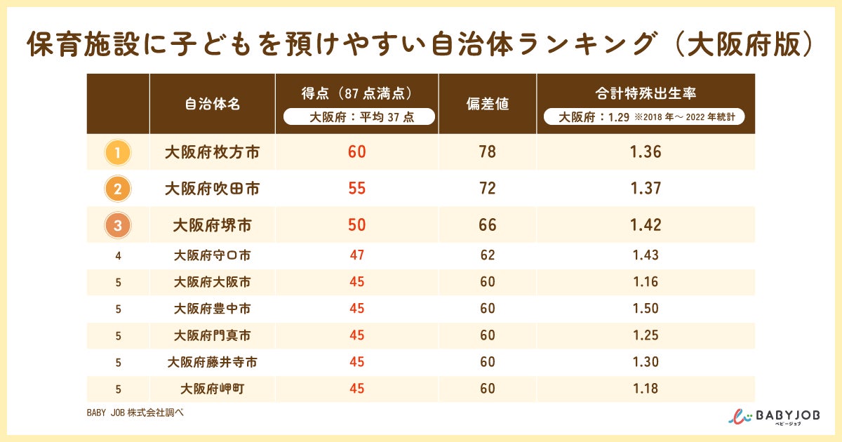 BABY JOBは、待機児童数、保育施設の探しやすさ、保育料、登園時の荷物量など、保育施設に子どもを預ける際の重要なポイントについて87点満点で調査を実施し、大阪府内におけるランキングを作成しました。
