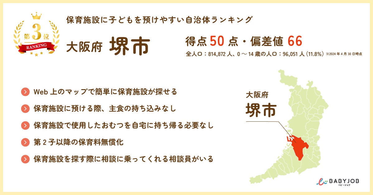 子育て課題に向き合うBABY JOB株式会社(本社:大阪府大阪市、代表取締役 上野公嗣)は、電話調査と自治体のサイトから得た情報を基に「2024年 保育施設に子どもを預けやすい自治体ランキング(大阪府版)」を作成しました。