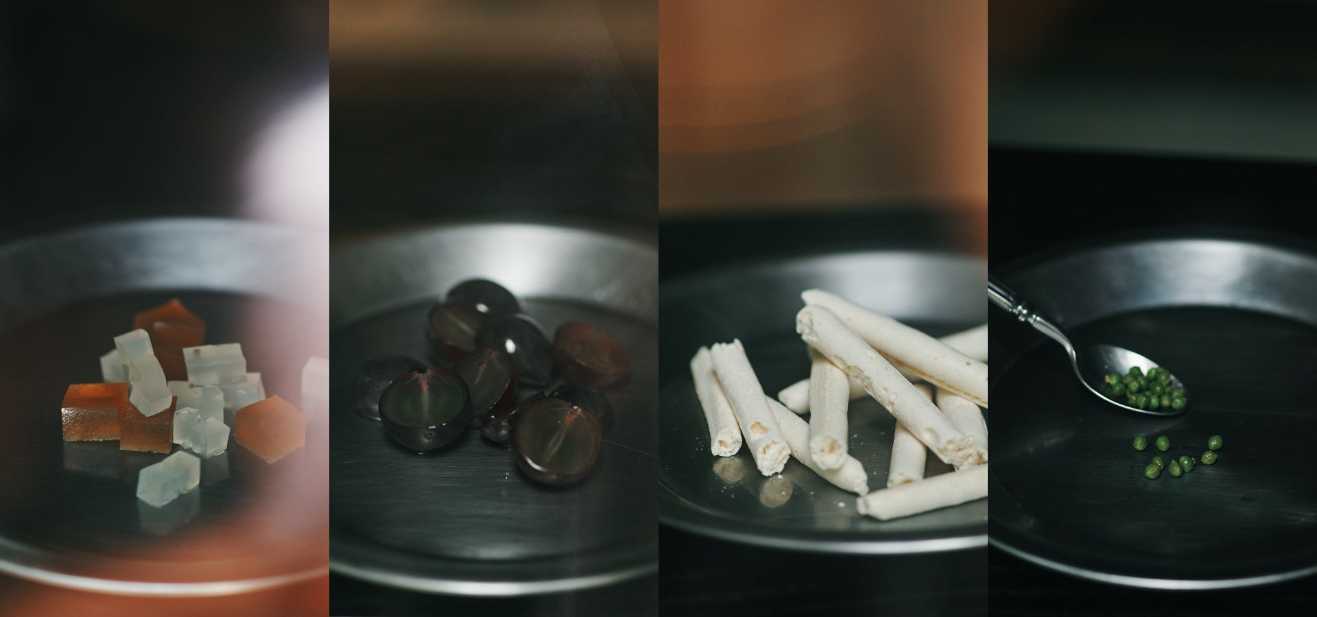 実山椒/レモンジュレ/マデラ酒ジュレ/巨峰ゼリー/バニラカスタード/ミルキーソース