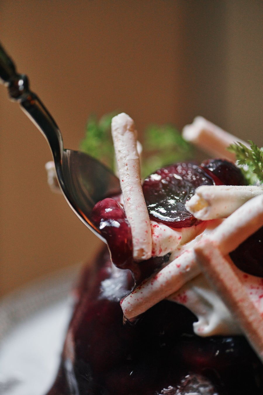 ミルキーソース/巨峰ソース/チーズホイップ/ナガノパープルのコンポート/メレンゲ/セルフィーユ/ラズベリーパウダー