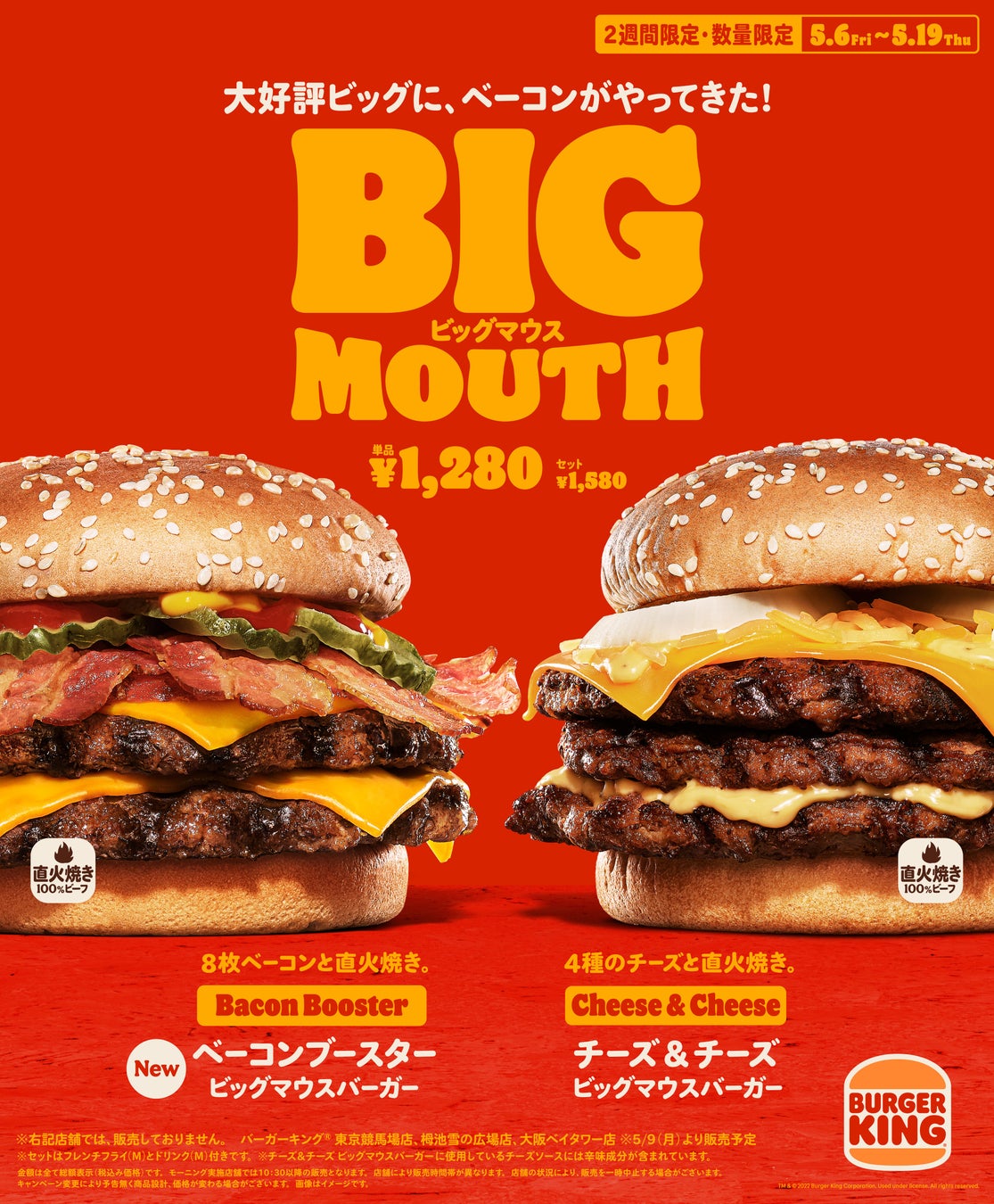 株式会社ビーケージャパンホールディングス(本社:東京都千代田区)は、2022年5月6日(金)~5月19日(木)の2週間限定・数量限定で、直火焼きの100%ビーフパティを使用した『ベーコンブースター ビッグマウスバーガー』『チーズ&チーズ ビッグマウスバーガー』を発売いたします。また、同日より『わたくしのキャラメルサンデー(キャラメル&コーヒー テイスト)』をお得な「お試し価格」にて新発売いたします。