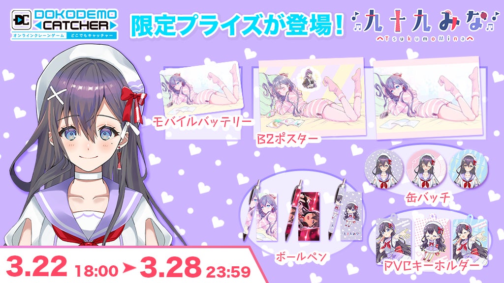 株式会社DC7(本社:京都府京都市 運営:大阪府大阪市)が運営するオンラインクレーンゲーム「どこでもキャッチャー」と、兵庫県神戸発の人工知能VTuber/VSinger「九十九みな」さんとのコラボイベント開催をお知らせします。