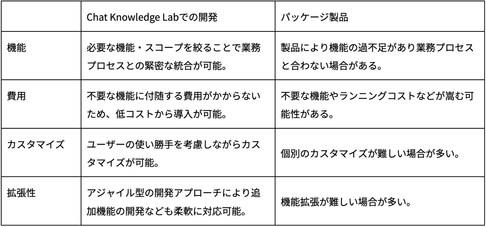 パッケージ製品の導入とは異なり、当社が持つナレッジマネジメントの知見を活用し、企業ごとのニーズに応じた機能設計を行うことで迅速かつ低コストでのシステム提供を実現します。また、アジャイル型の開発アプローチにより柔軟なカスタマイズと高度な拡張性を実現し、業務プロセスに最適化されたユーザー体験の提供が可能です。