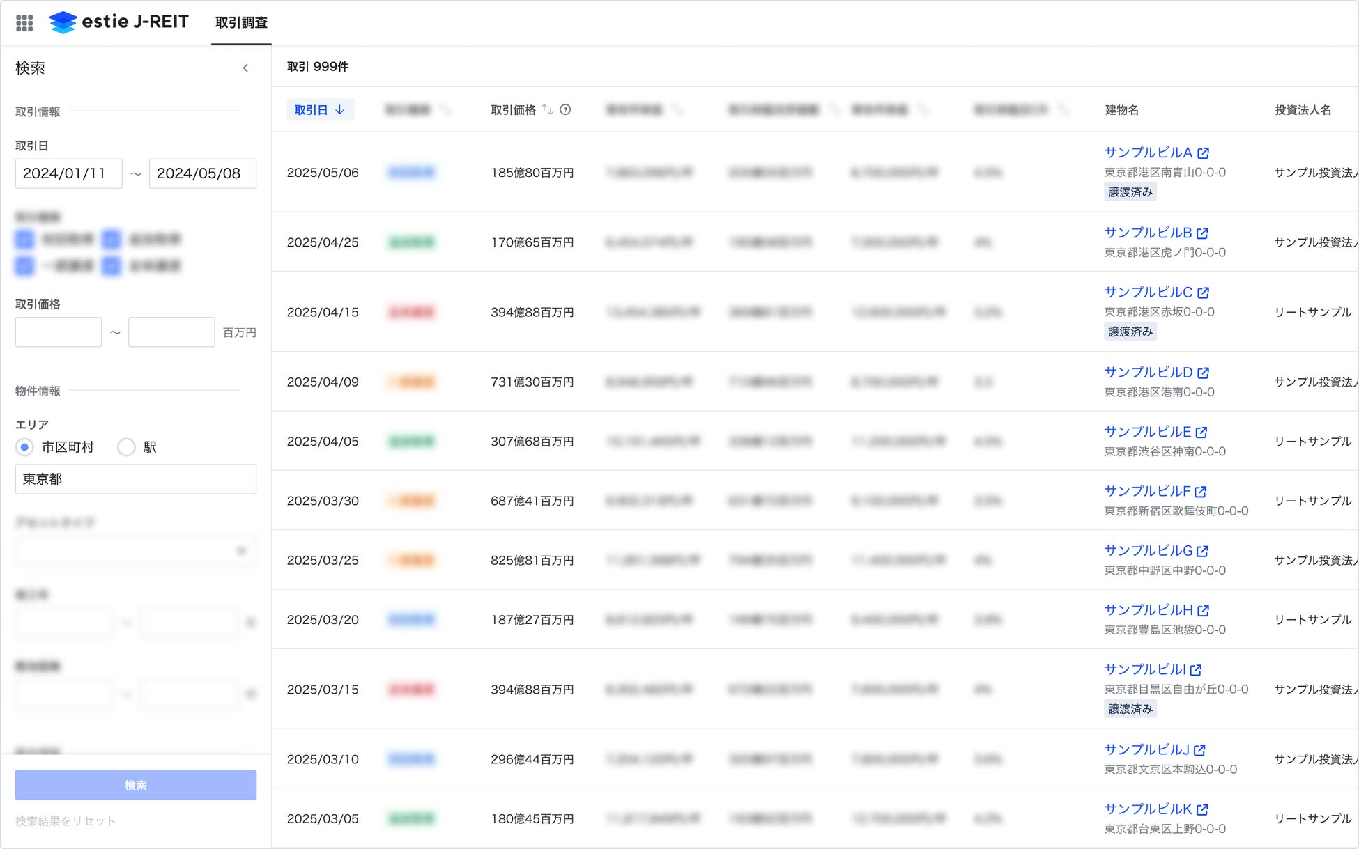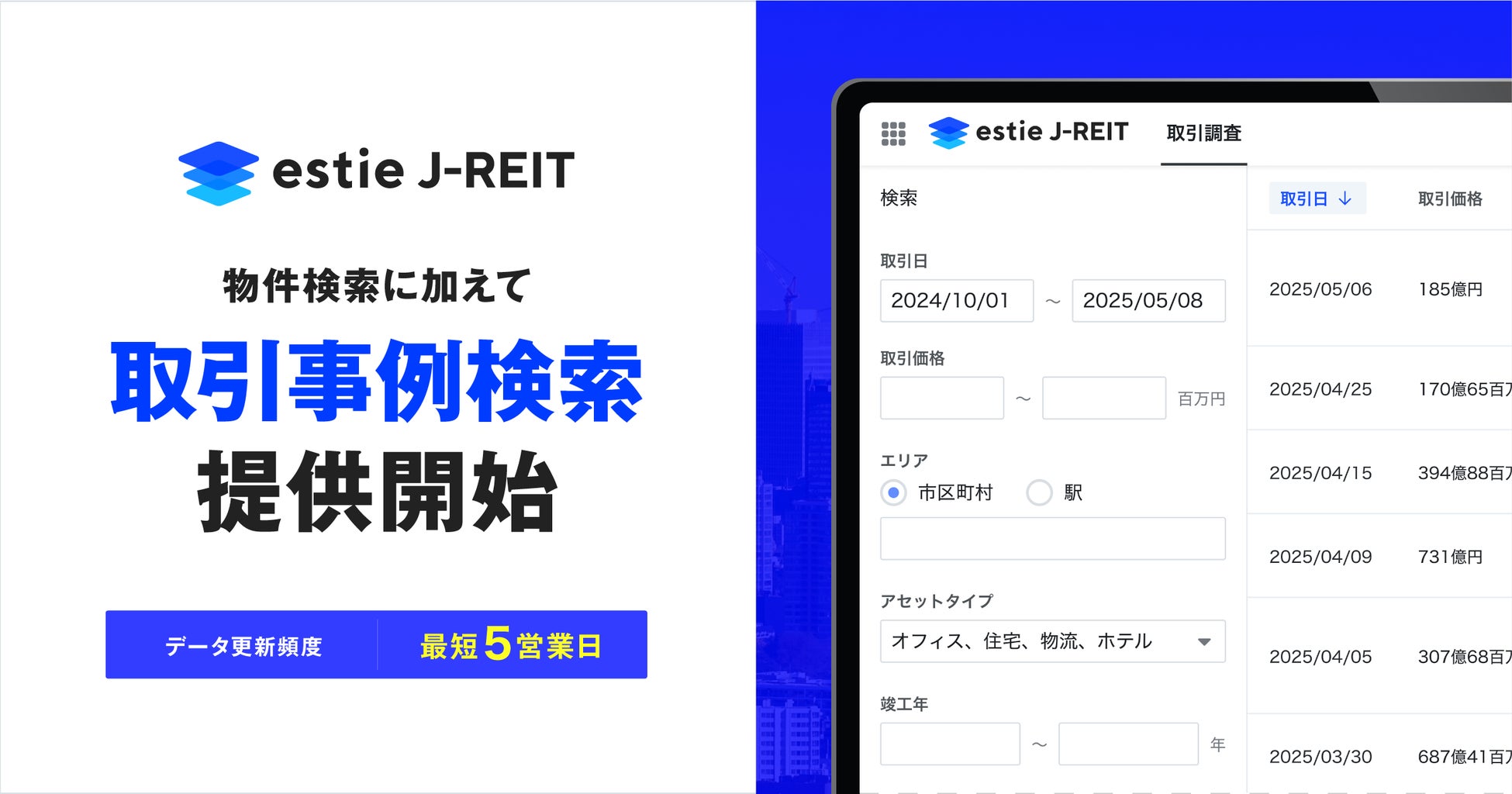 J-REIT物件情報の横断検索ができる「estie J-REIT」に取引事例の検索機能を追加