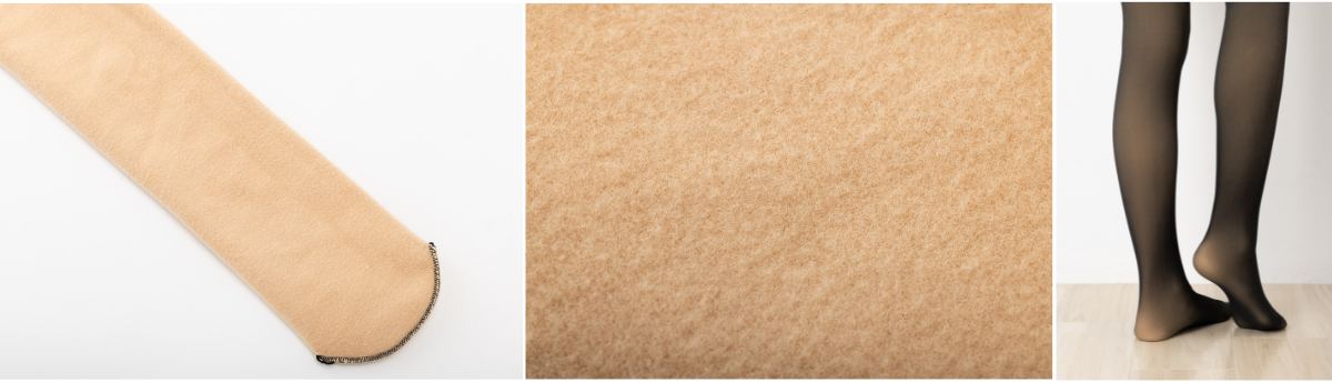 ・従来品の多くは、足首までしが裏起毛で覆われておらず、足首とつま先に段差が出来てしまうことが懸念されておりました。見た目が気になるというユーザーの意見をもとに、つま先まで裏起毛にし、足先まで滑らかな美しさを再現しました。