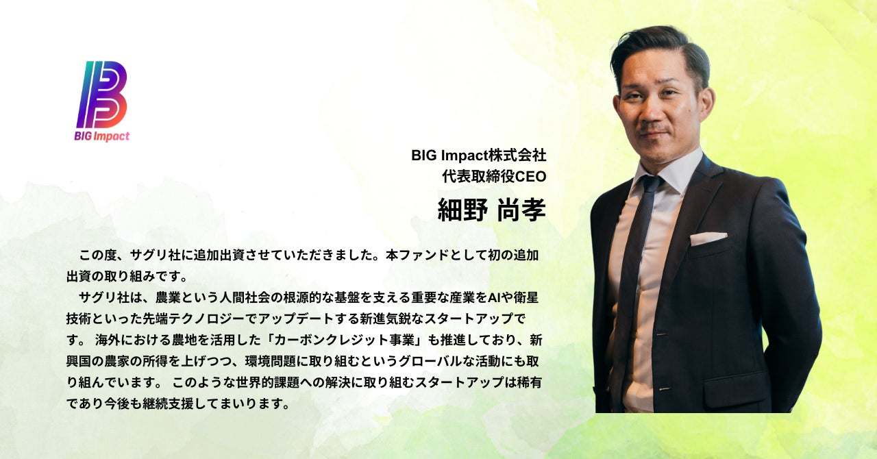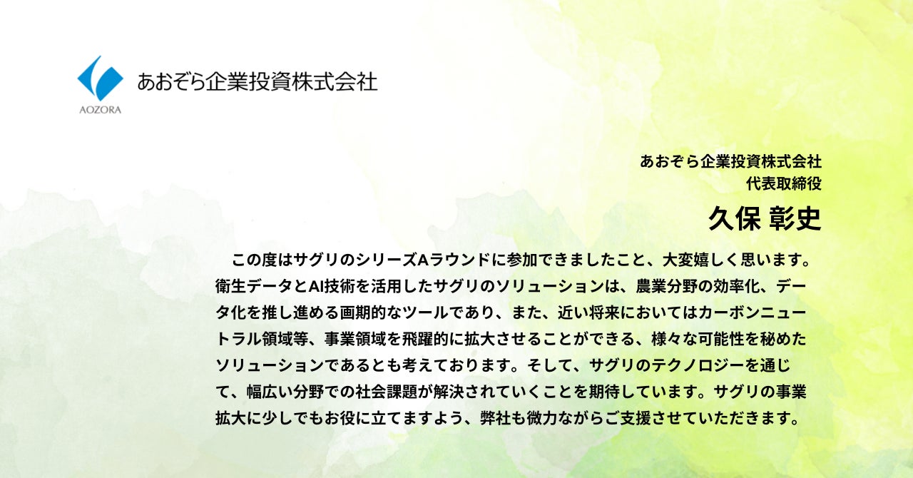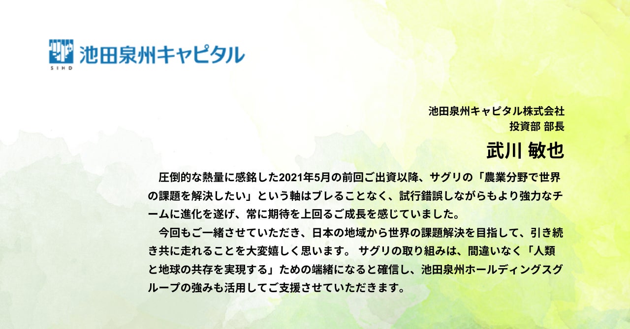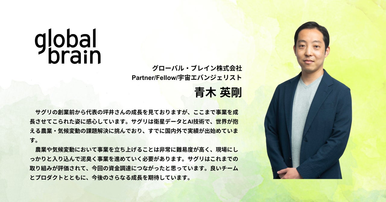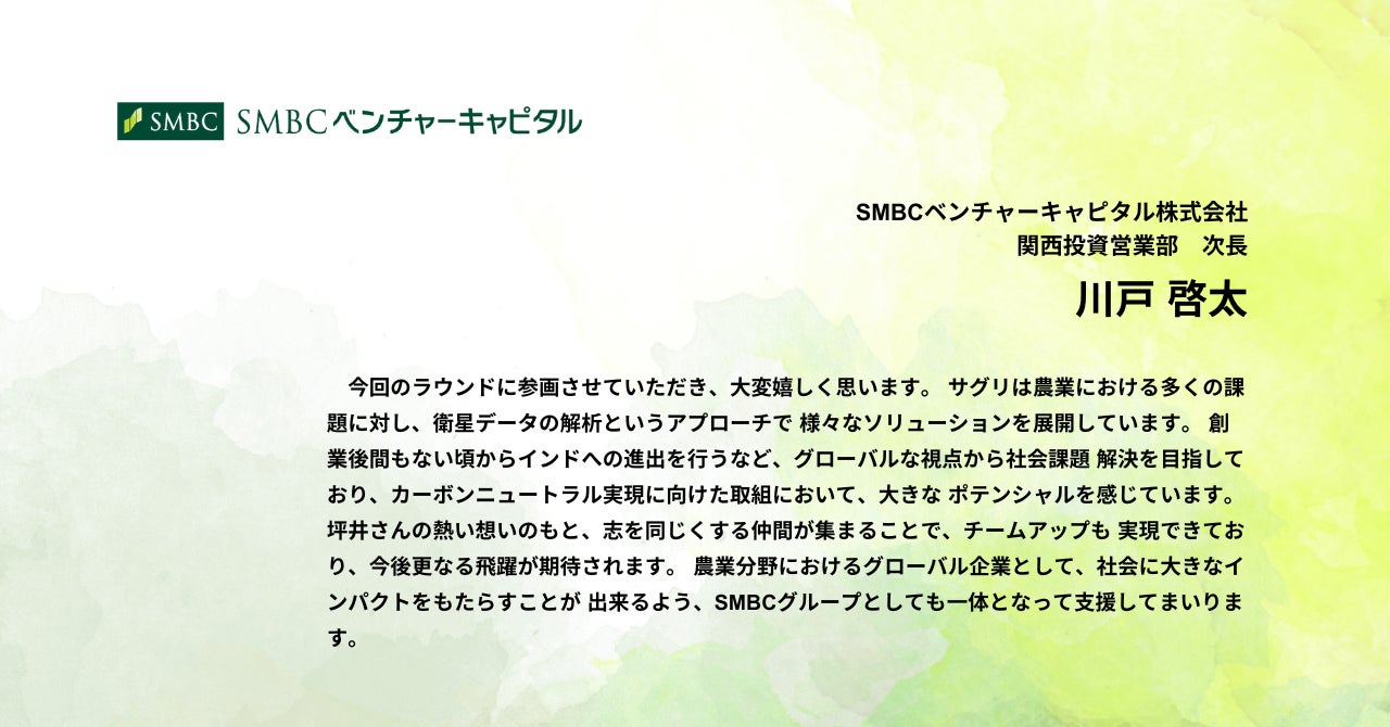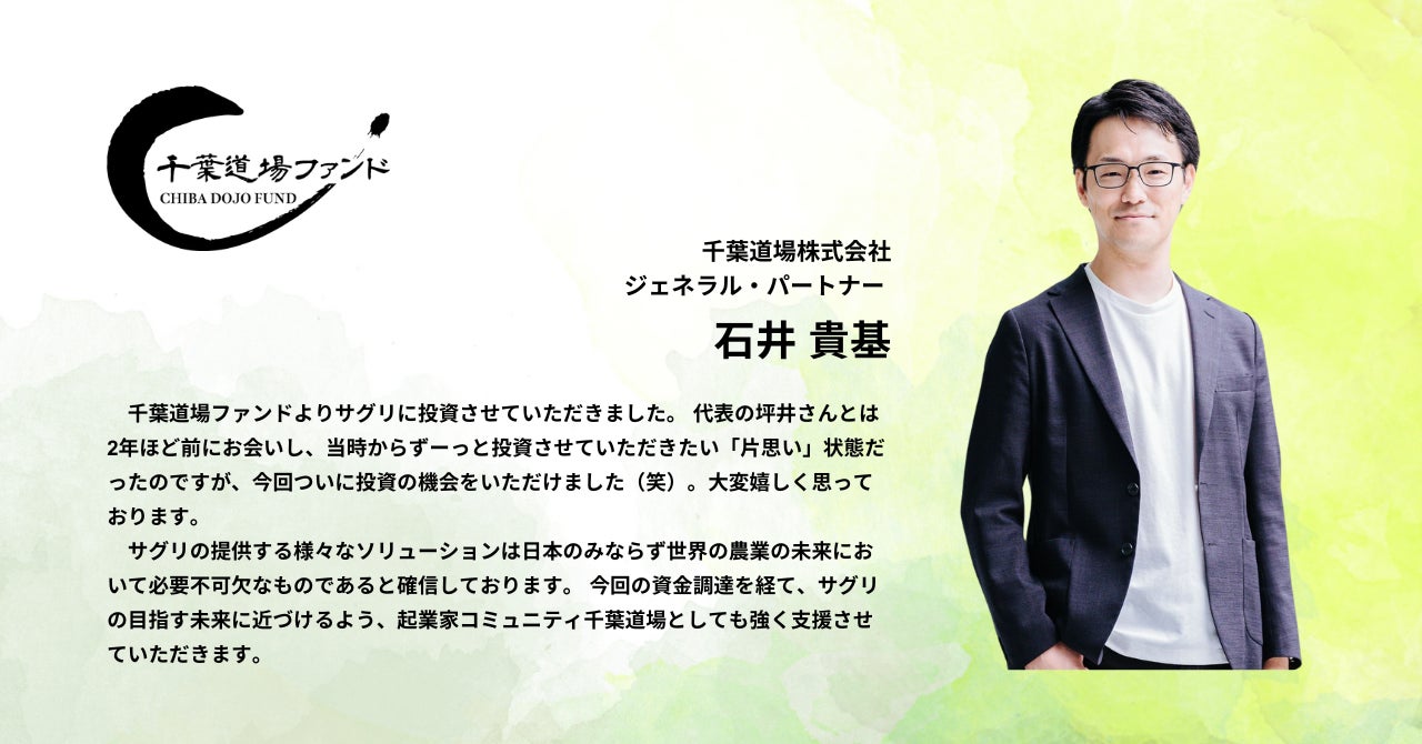 サグリ株式会社( 本社:兵庫県丹波市、代表取締役:坪井 俊輔、以下「サグリ」)は、千葉道場株式会社、グローバル・ブレイン株式会社が運営する複数のファンド、スパークル株式会社、SMBCベンチャーキャピタル株式会社、静岡キャピタル株式会社、あおぞら企業投資株式会社、BIG Impact株式会社、池田泉州キャピタル株式会社、北海道ベンチャーキャピタル株式会社、レオス・キャピタルパートナーズ株式会社、株式会社グロービスなどがそれぞれ運営するファンドおよび、メルカリ創業者 石塚亮、SmartHR創業者 / Nstock CEO 宮田昇始などのエンジェル投資家を引受先とした第三者割当増資により、約10億円の資金調達を実施しました。