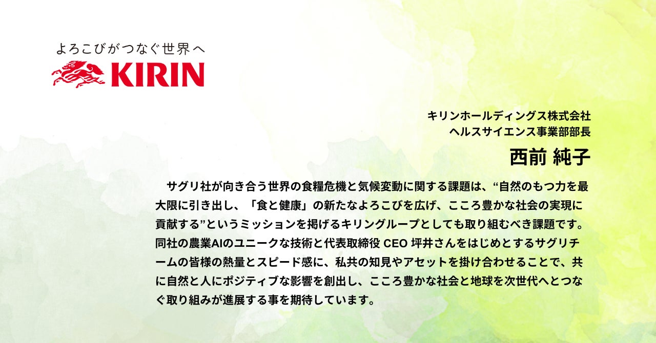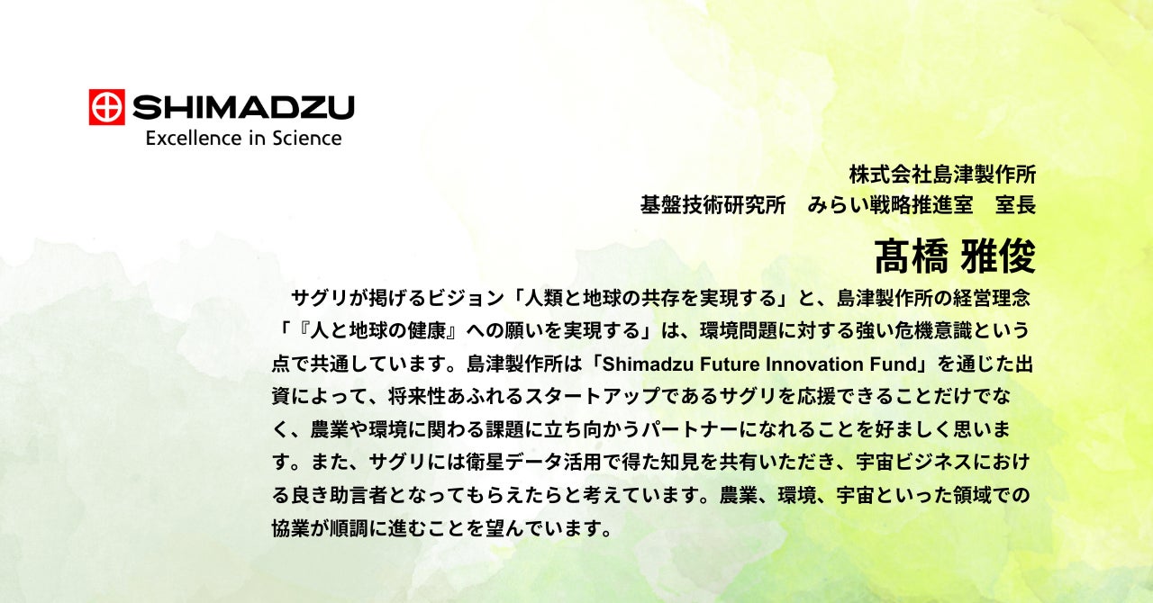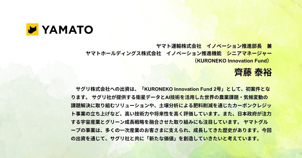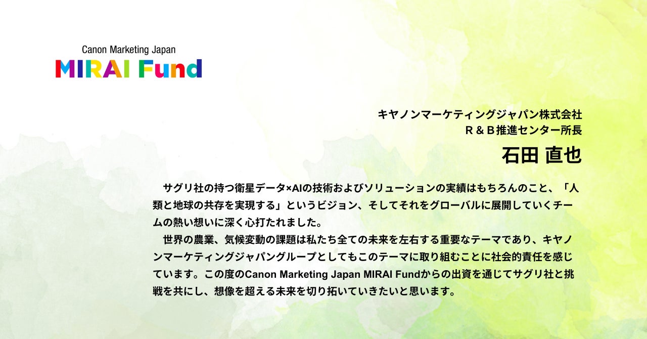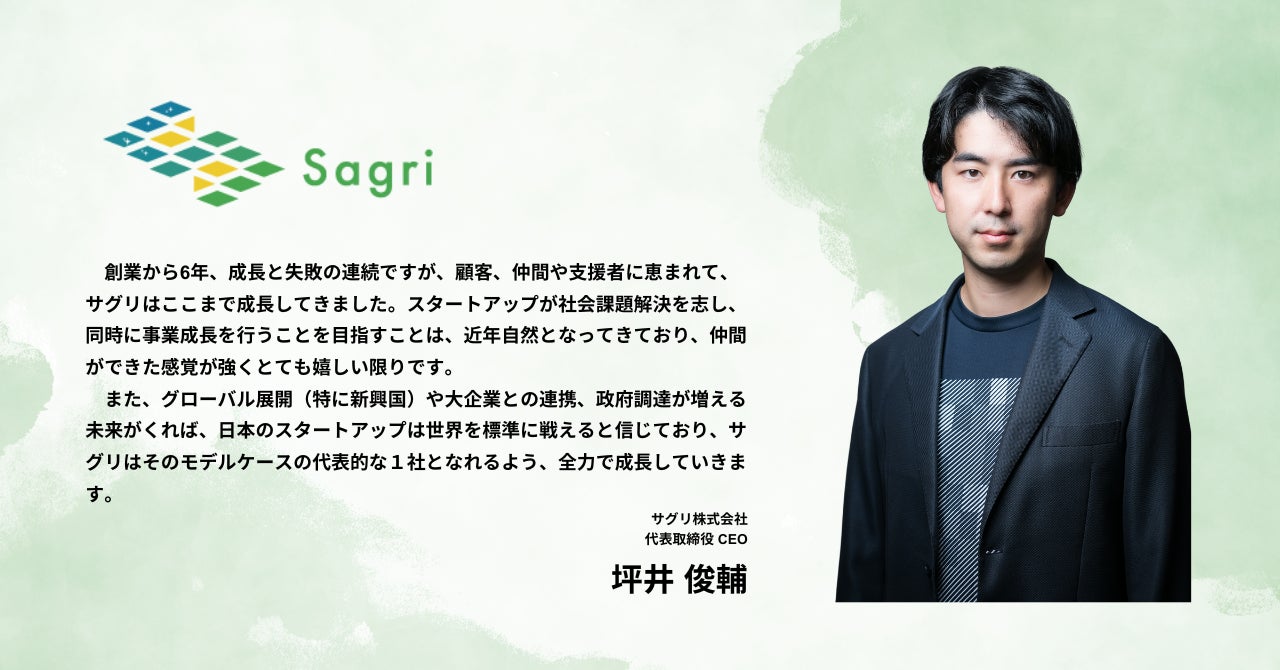 サグリはこれまで農地管理支援ソリューション「アクタバ」「デタバ」「ニナタバ」、農業現場の営農支援ソリューション「Sagri」を提供してきましたが、今後、民間企業向けの農地マッチングや脱炭素事業による事業拡大を進めていき、「人類と地球の共存を実現する」未来を創りたいと考えています。