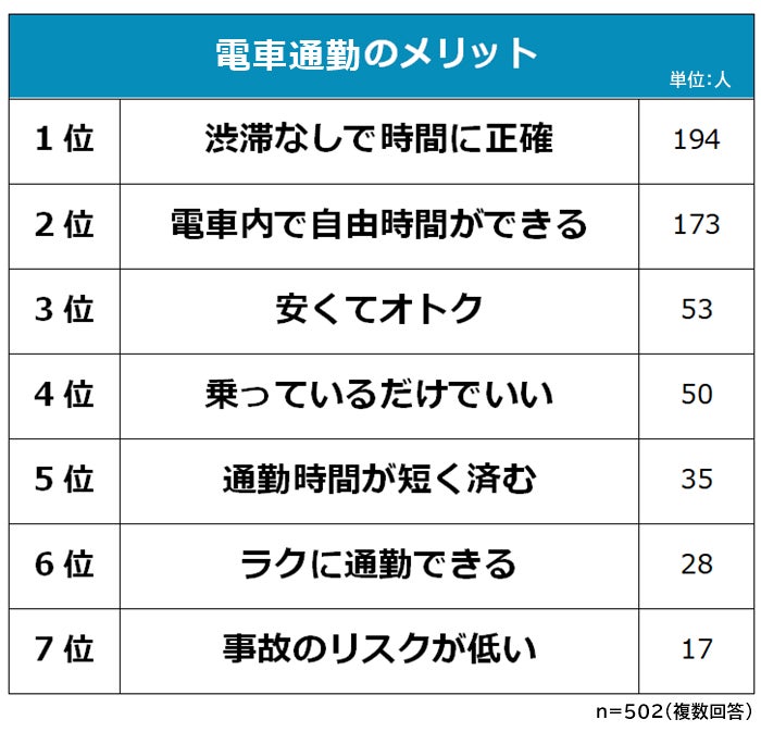 電車通勤をしている人502名に「電車通勤のメリット」を聞いたところ、1位は「渋滞なしで時間が正確(194人)」でした。