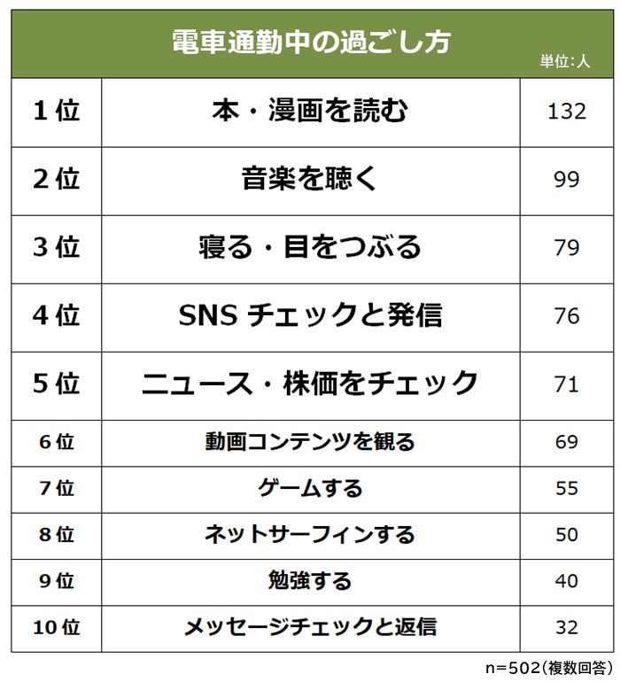 電車通勤をしている人502名に「電車通勤中の過ごし方」を聞いたところ、1位は「本・漫画を読む(132人)」でした。