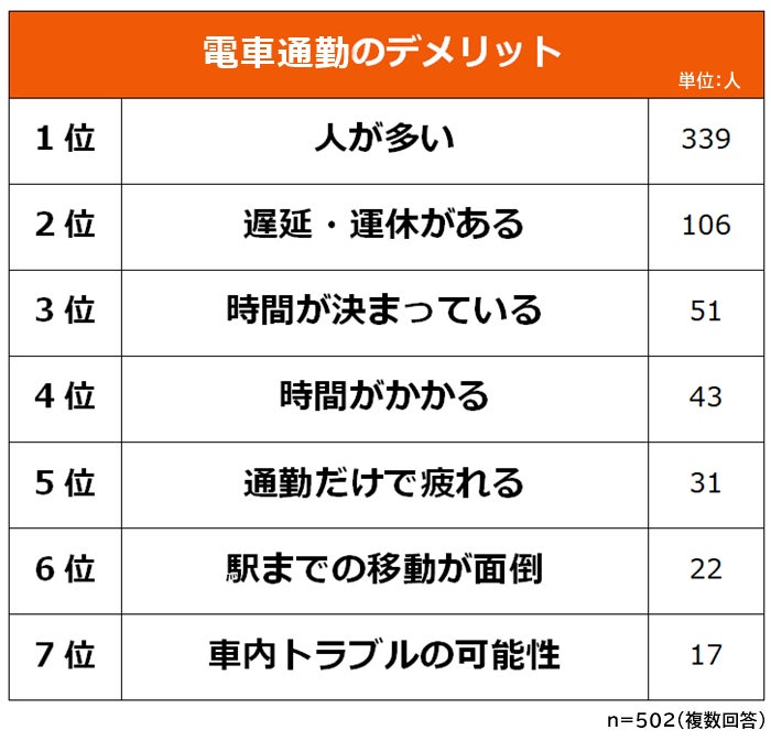 電車通勤をしている人502名に「電車通勤のデメリット」を聞いたところ、1位は「人が多い(339人)」でした。